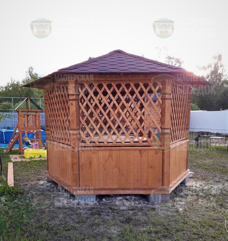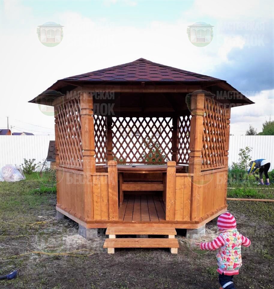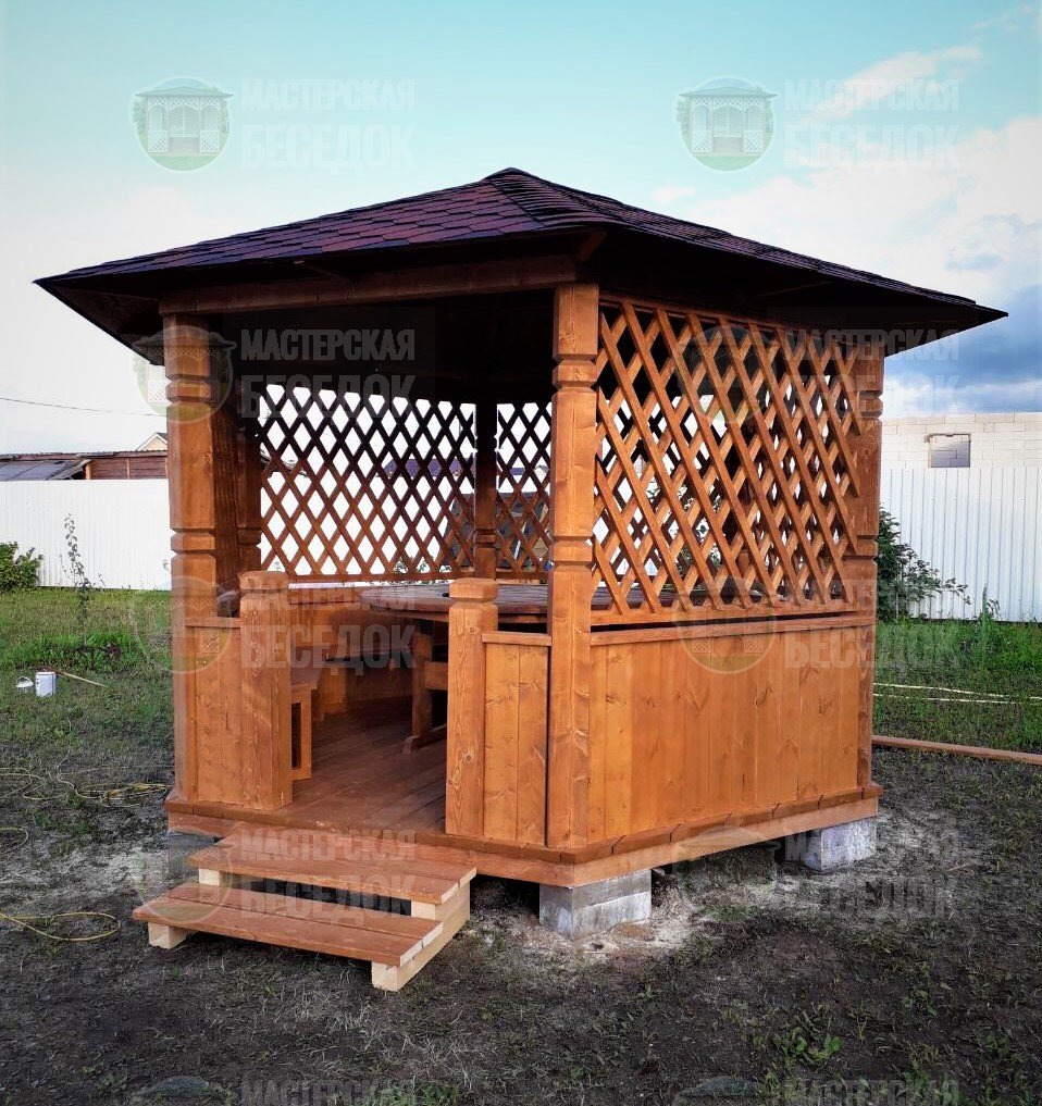 Деревянная беседка “Богатырская” это мощь и сила дерева! Резные столбы придают этой беседке Русский Стиль и Русский Дух. Вся конструкция выполнена их сухих материалов камерной сушки. Только в таком случае беседка (и ее пропитка) будет служить Вам долго. На нашем производстве возможны любые модификации и изменения размеров и дизайна.