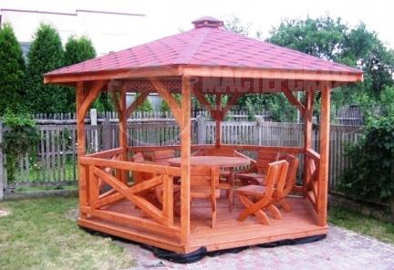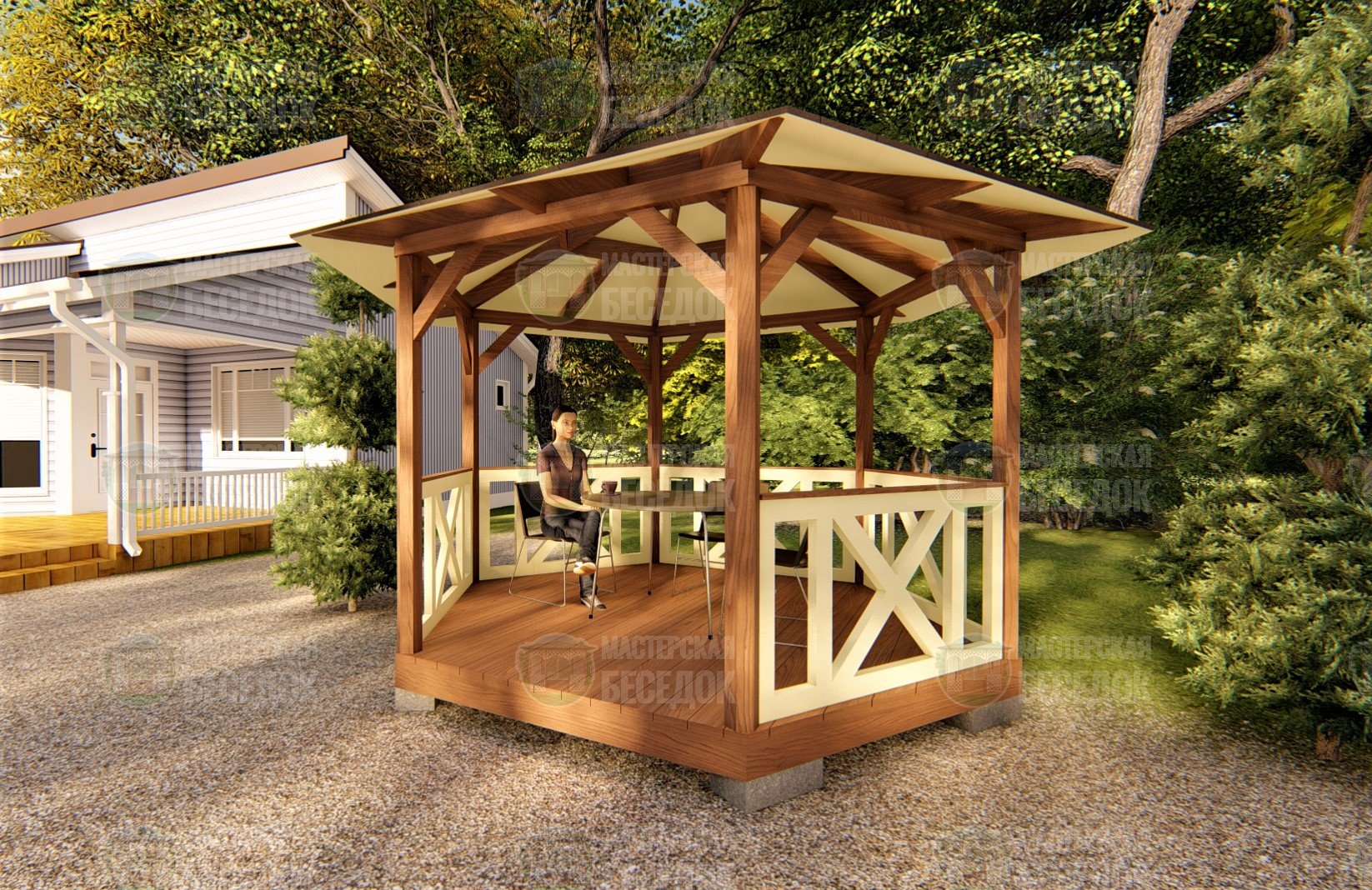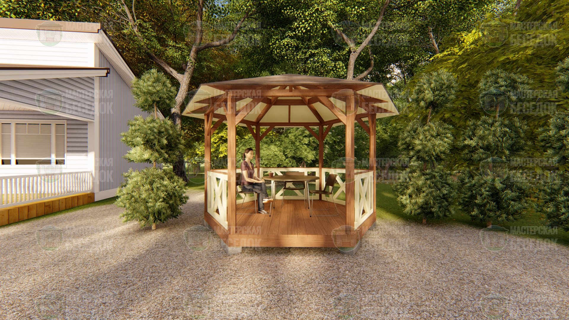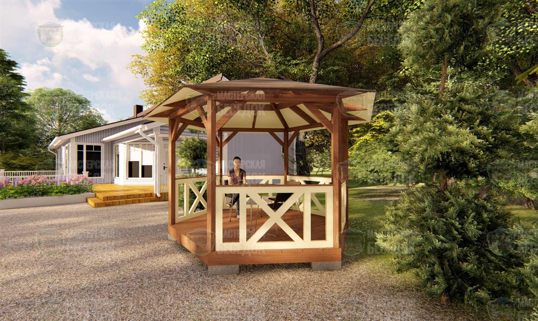 Деревянная беседка для дачи “Фазенда” - шестигранная беседка, похожа на "Летнюю", однако отличается от нее формой ограждений. Такую беседку возможно установить как на цементные блоки, так и на заранее подготовленную площадку.