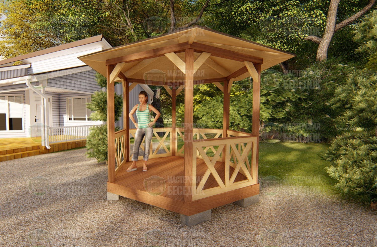 Деревянная беседка “Московская Жара” простая, но в то же время стильная беседка с ограждениями в виде перекрестий и массивными деревянными столбами. В такую беседку мы можем дополнительно изготовить и смонтировать деревянные лавки по периметру.