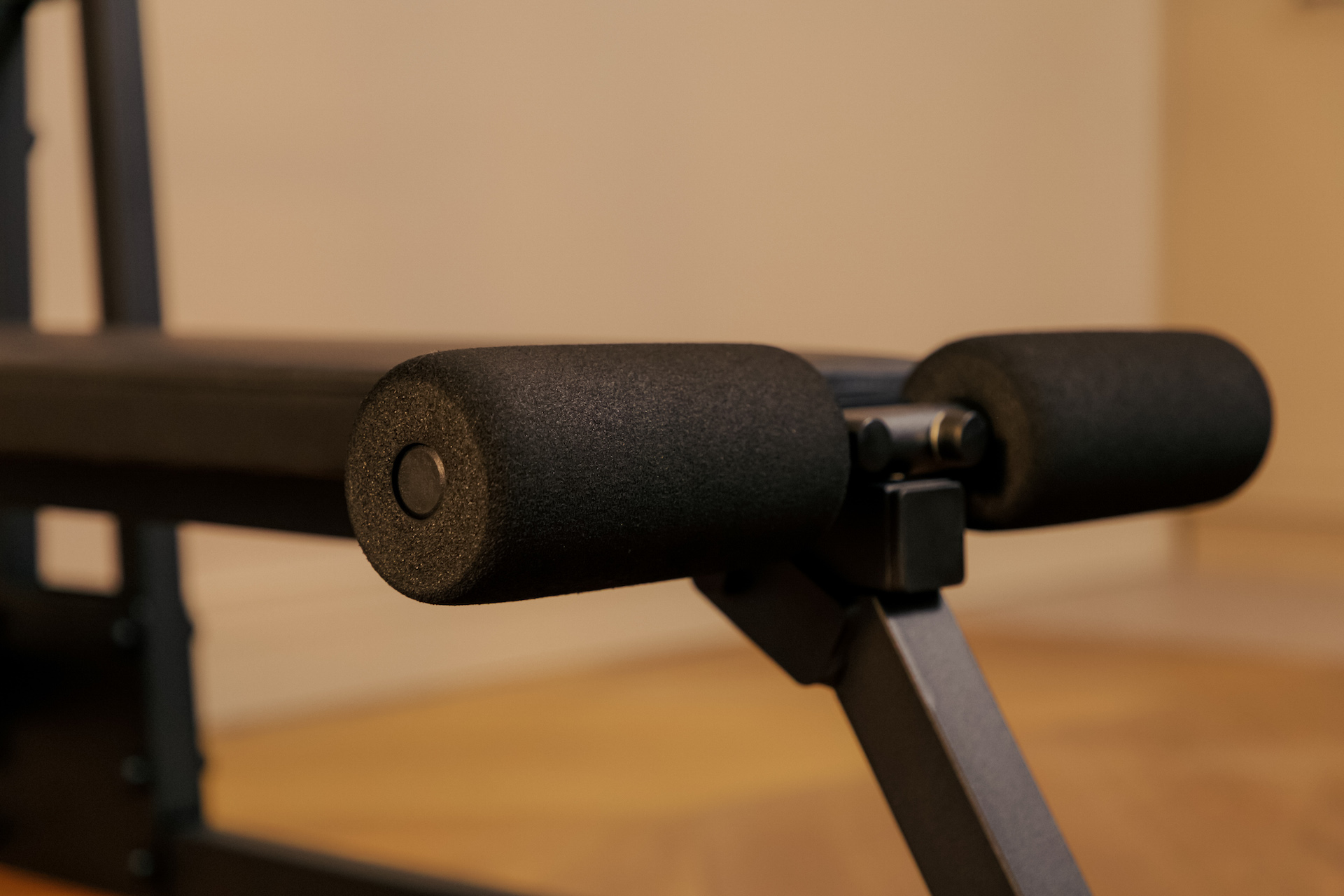 При тренировке пресса, вам будет комфортно заниматься благодаря удобным подколенным валикам с мягким наполнителем.