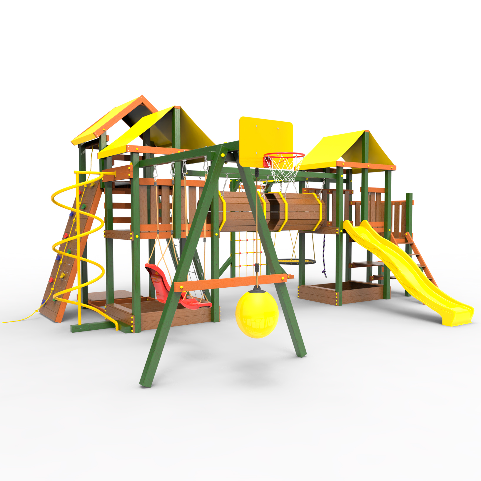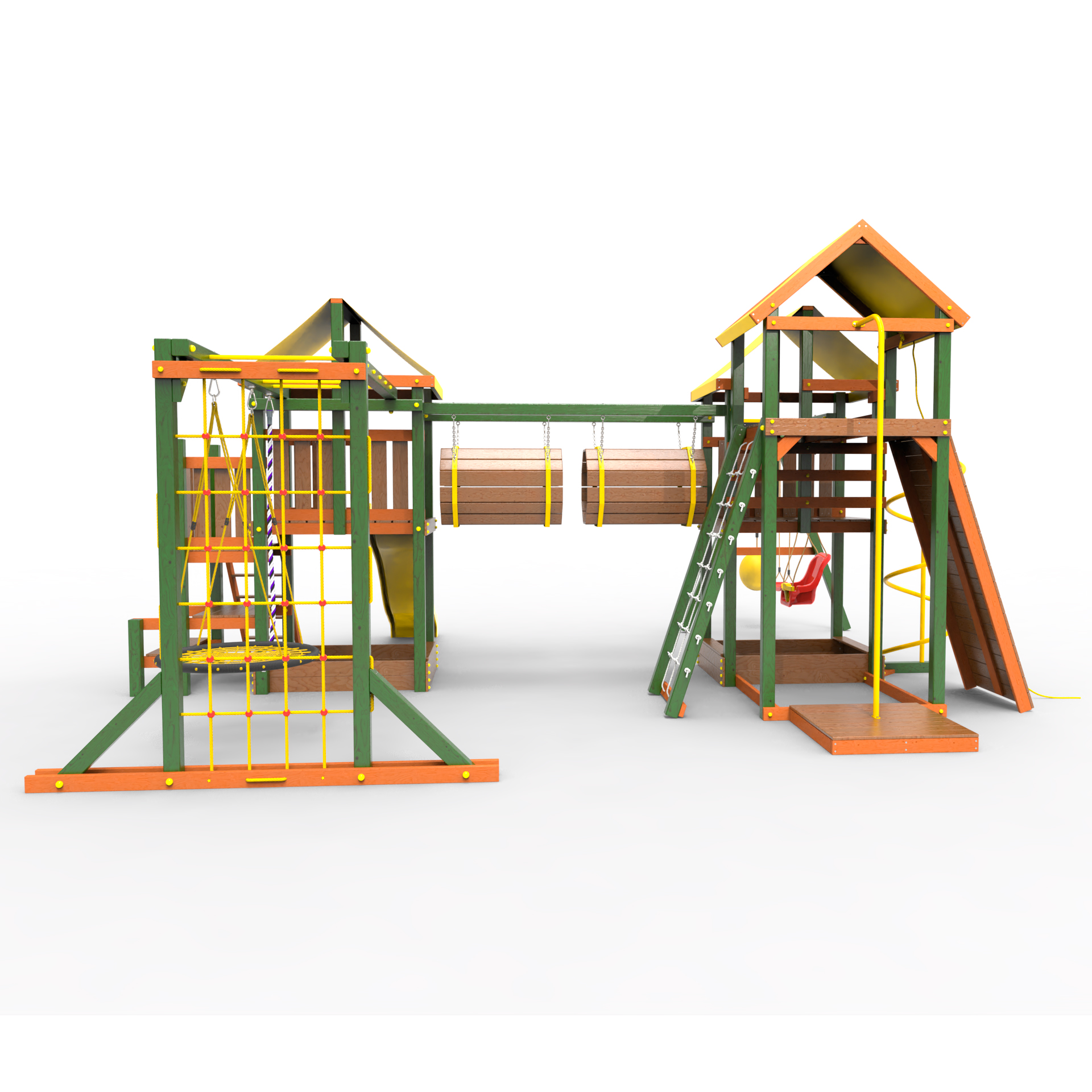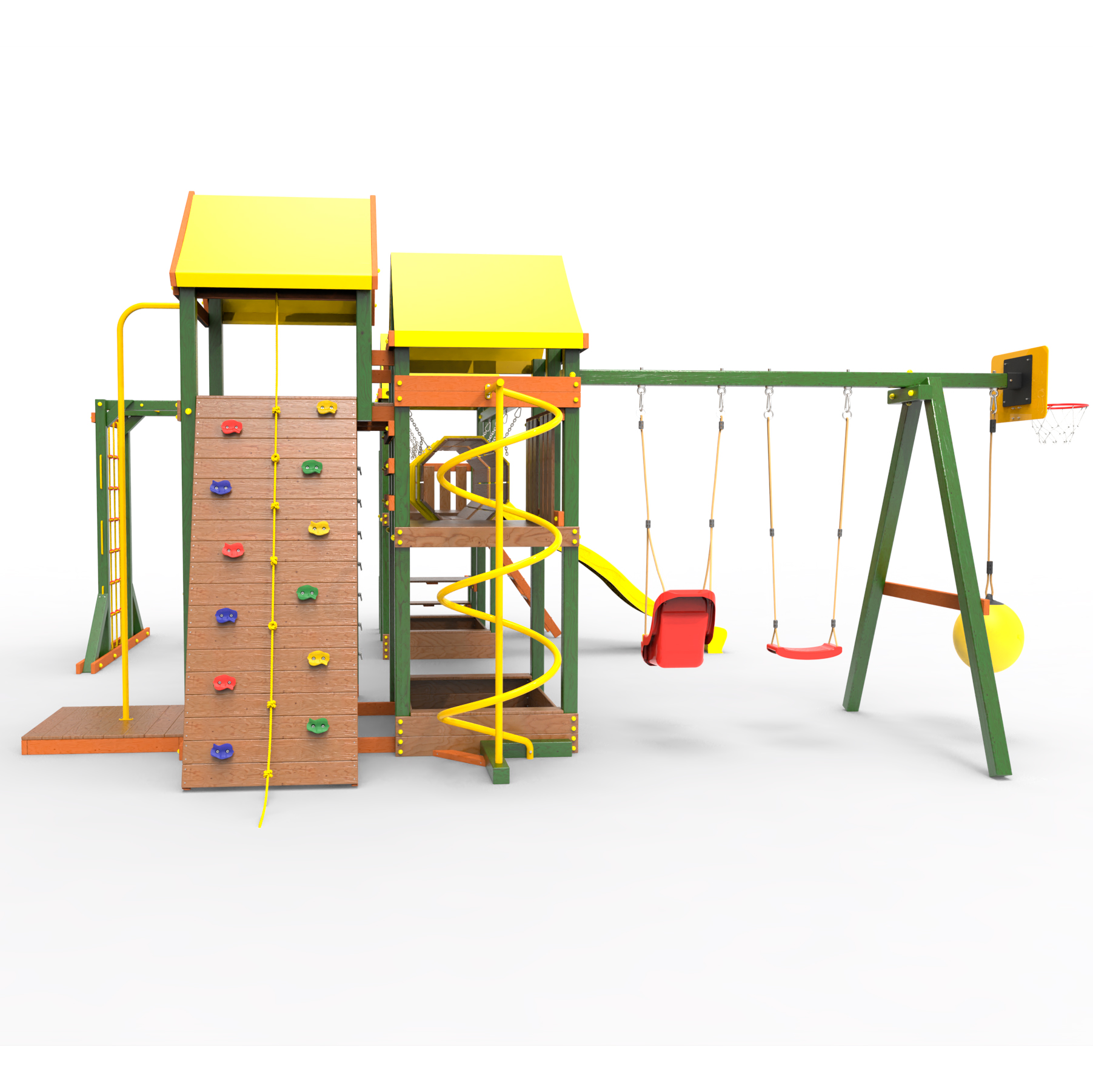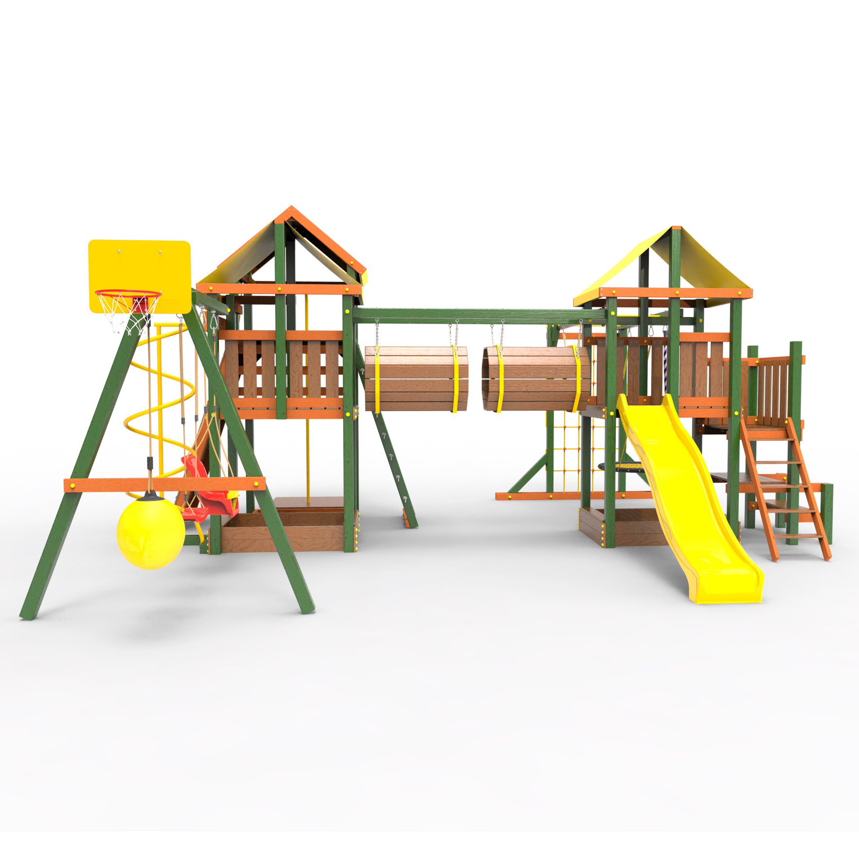 Два домика|Песочница|Лестница|Шторм-трап|Скалодром|Рукоход|Шведская стенка|Турник|Руфер|Баскетбольная корзина|Мостик|Горка|Спираль|Волна|Сеть для лазания|Качели |