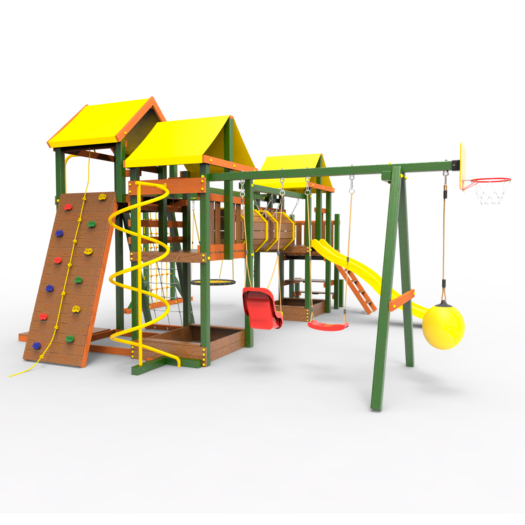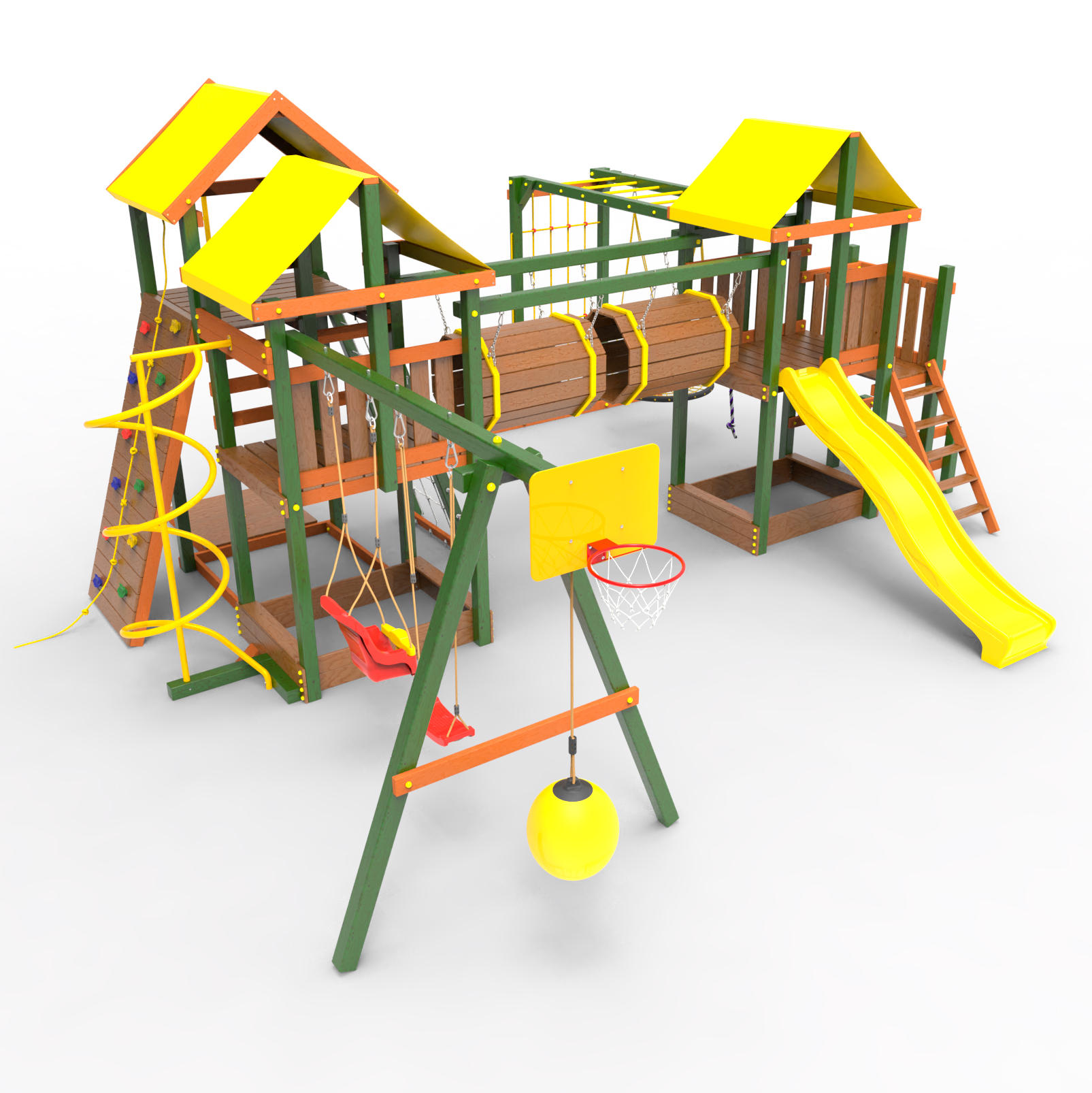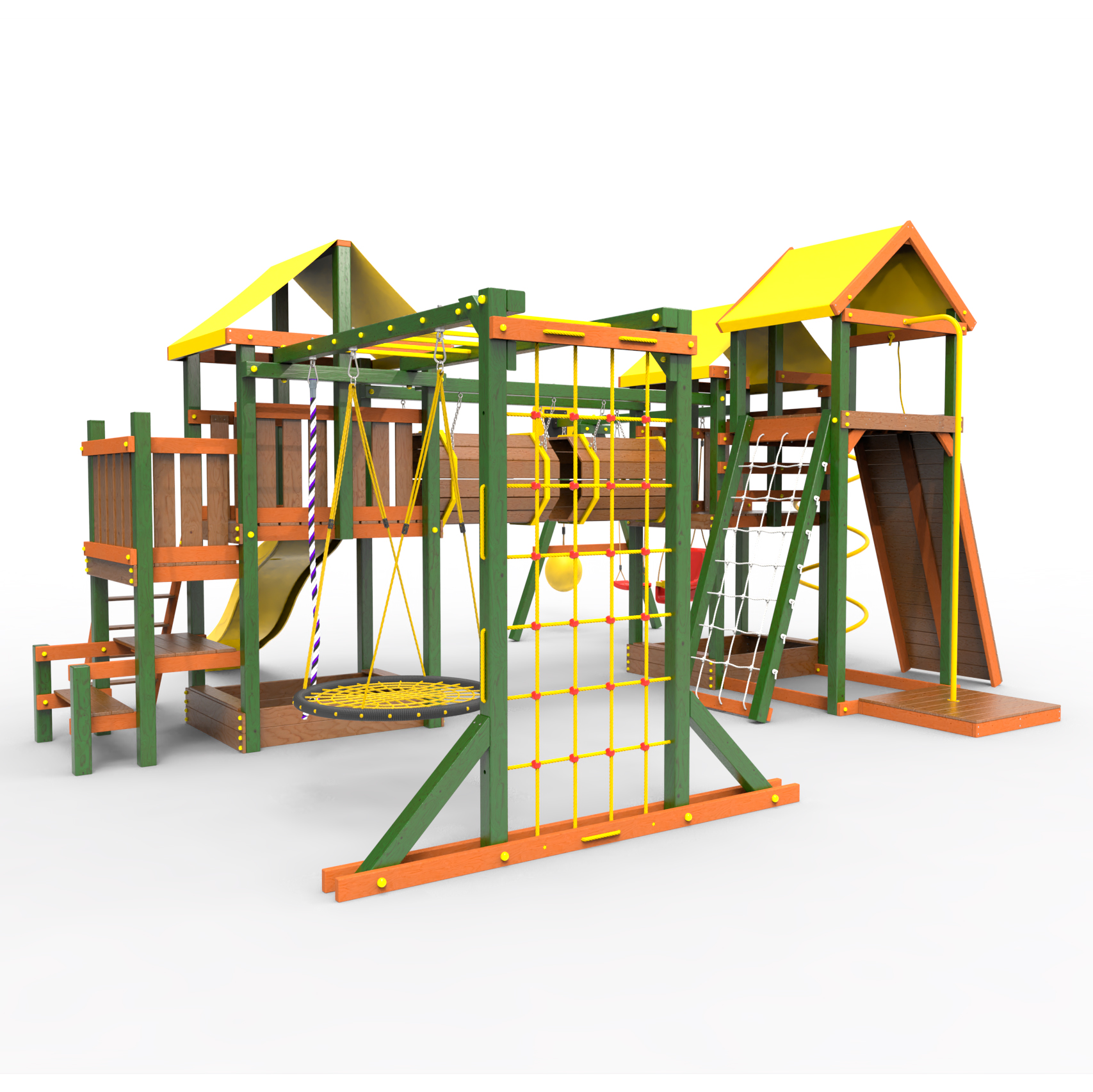 Два домика|Песочница|Лестница|Шторм-трап|Скалодром|Рукоход|Шведская стенка|Турник|Руфер|Баскетбольная корзина|Мостик|Горка|Спираль|Волна|Сеть для лазания|Качели |