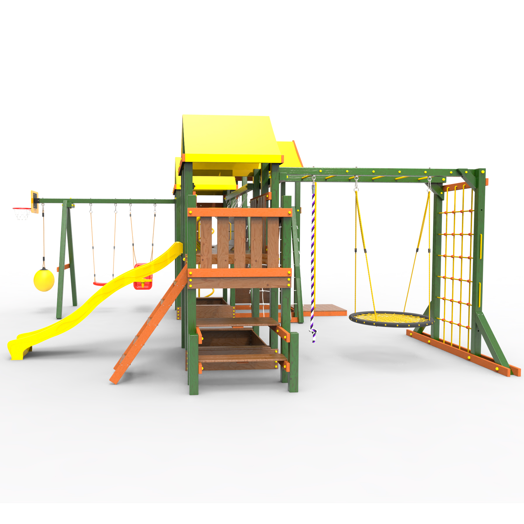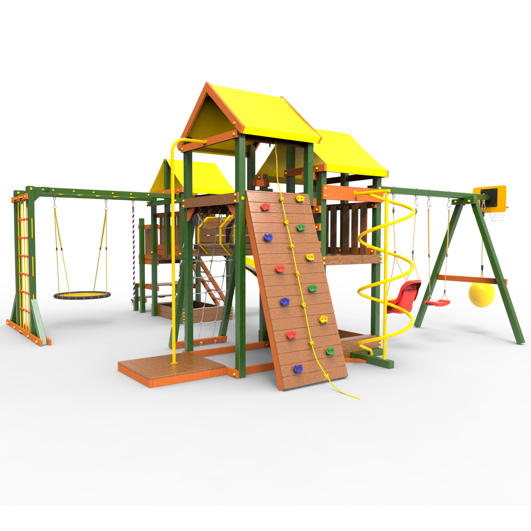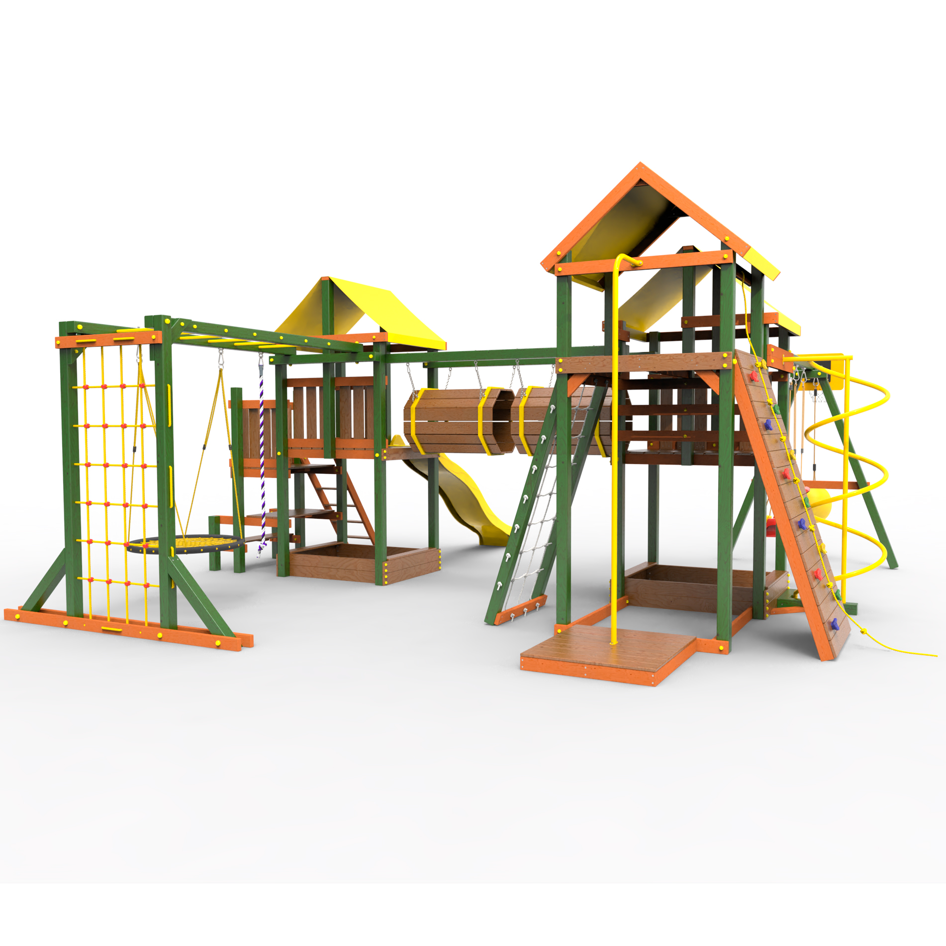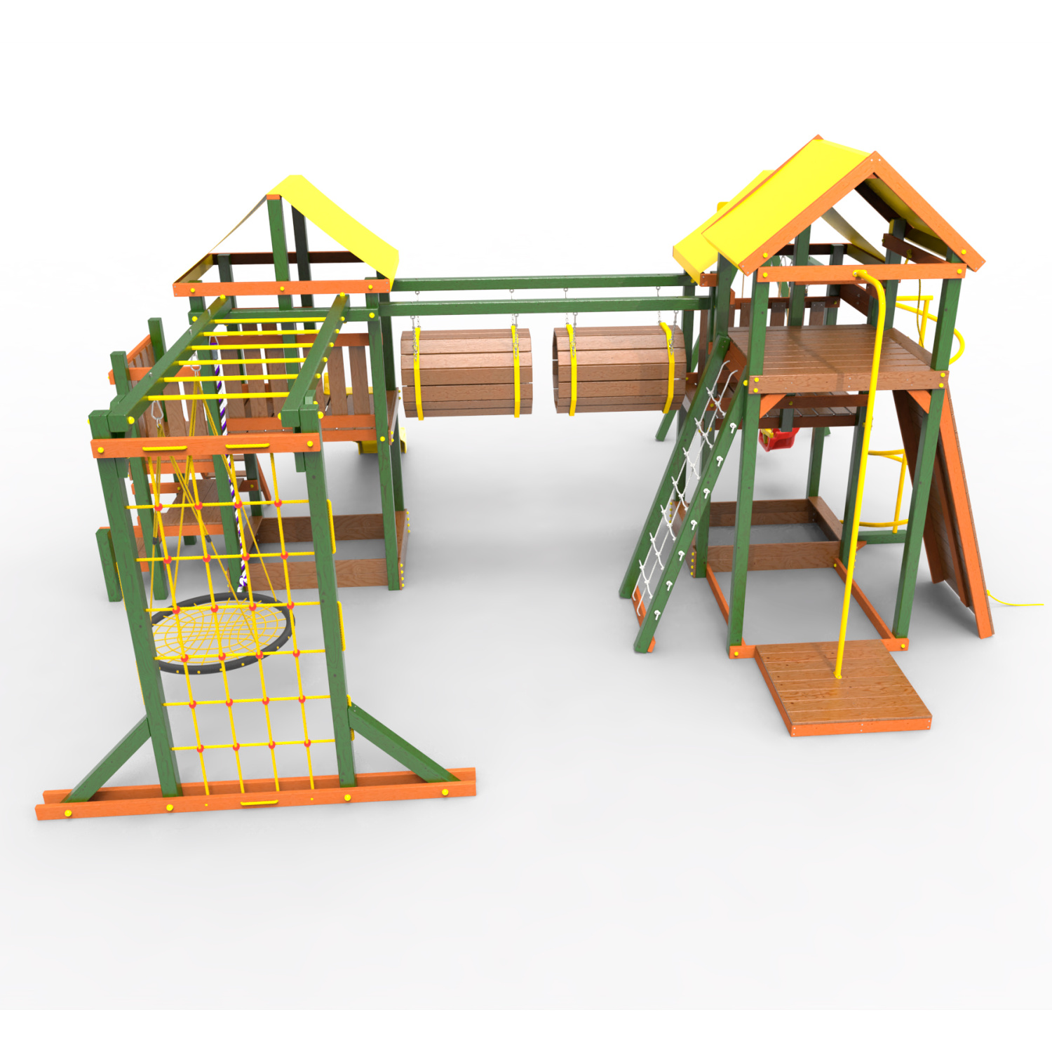 Два домика|Песочница|Лестница|Шторм-трап|Скалодром|Рукоход|Шведская стенка|Турник|Руфер|Баскетбольная корзина|Мостик|Горка|Спираль|Волна|Сеть для лазания|Качели |