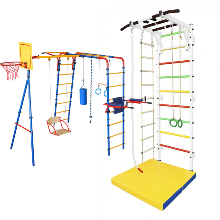 - Детские спортивные комплексы для дома идеально впишутся в любой стиль интерьера комнаты. В состав группы снарядов для занятий обычно входят качели, турник, брусья, веревочная лестница или канат, кольца и шведская стенка. Изделия имеют компактные габаритные размеры, так что вы сможете легко менять их местами и перемещать по комнате.