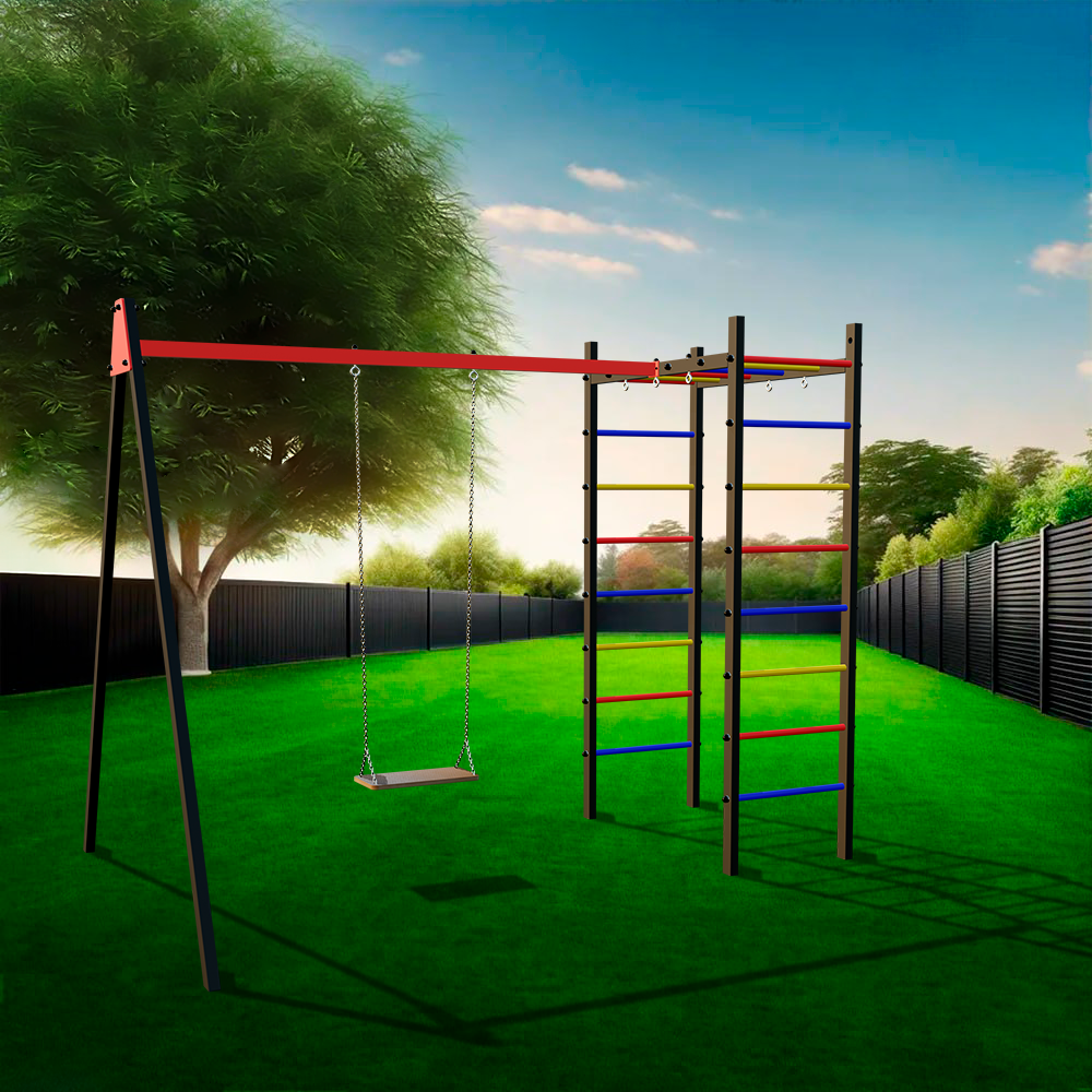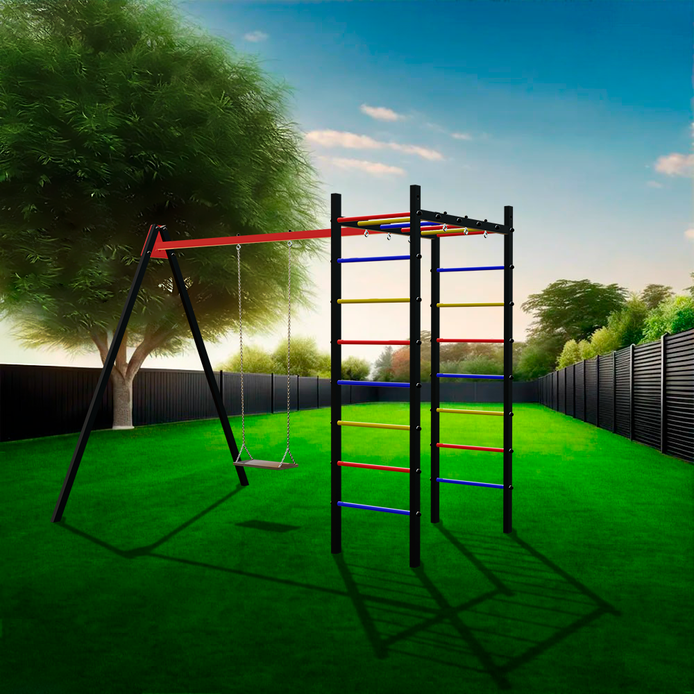 Уличный спортивно-игровой комплекс Sv Sport (с качелями) изготовлен из профильной трубы 60х40 мм, толщиной 3 мм (балка качелей), 2 мм (опоры и рукоход). Крепление опор изготовлено из пластины, толщиной 5 мм. Окрашен уличный спортивно-игровой комплекс качественной, импортной порошковой краской в 3 слоя, которая устойчива к истиранию и температурным перепадам. Все торцы, болты, гайки закрыты пластиковыми заглушками отличного качества. Использующиеся болты и гайки оцинкованы и соответствуют требованиям ГОСТ. Устанавливается спортивно-игровой комплекс путем бетонировки на глубину не менее 600 мм (опоры рукохода) и 400 мм (опоры качелей).