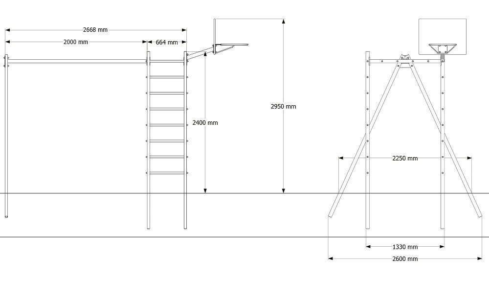 Уличный спортивно-игровой комплекс Sv Sport (с качелями) изготовлен из профильной трубы 60х40 мм, толщиной 3 мм (балка качелей), 2 мм (опоры и рукоход). Крепление опор изготовлено из пластины, толщиной 5 мм. Окрашен уличный спортивно-игровой комплекс качественной, импортной порошковой краской в 3 слоя, которая устойчива к истиранию и температурным перепадам. Все торцы, болты, гайки закрыты пластиковыми заглушками отличного качества. Использующиеся болты и гайки оцинкованы и соответствуют требованиям ГОСТ. Устанавливается спортивно-игровой комплекс путем бетонировки на глубину не менее 600 мм (опоры рукохода) и 400 мм (опоры качелей).