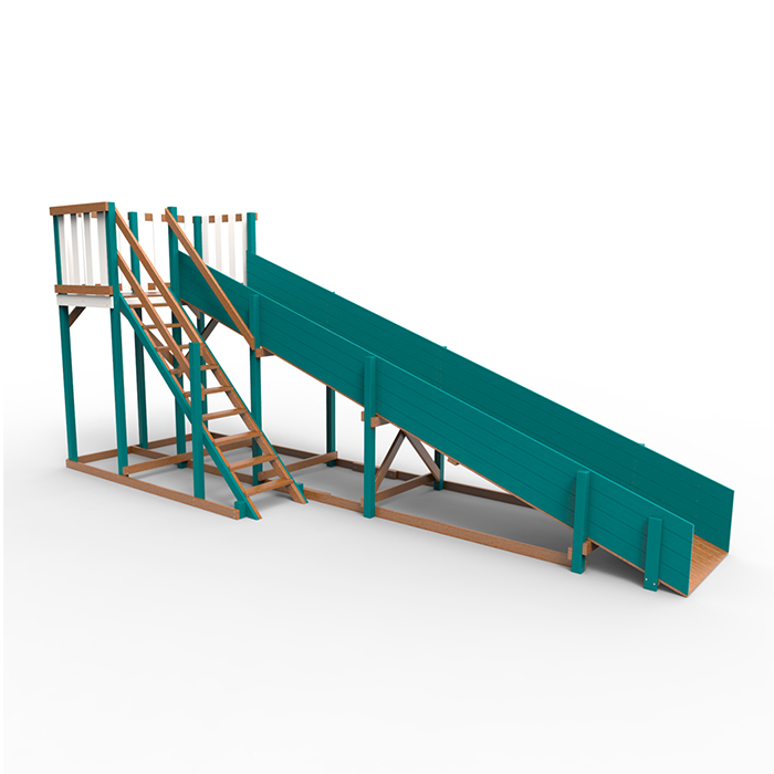 - Недорогие детские горки из массива древесины – довольно востребованный и доступный вариант. Все хорошо знают об исключительных природных свойствах дерева: оно экологически безопасно, не нагревается на жаре и не замерзает зимой. Впрочем, этот материал не лишен недостатков: под воздействием влаги он начинает стремительно разбухать, а под действием высоких температур – рассыхаться. Специалисты рекомендуют использовать пропитку специальными составами: так можно немного продлить срок службы изделия.