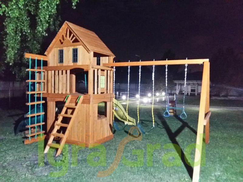 - двухуровневый домик с красивыми пластиковыми окошками зашитый снизу;