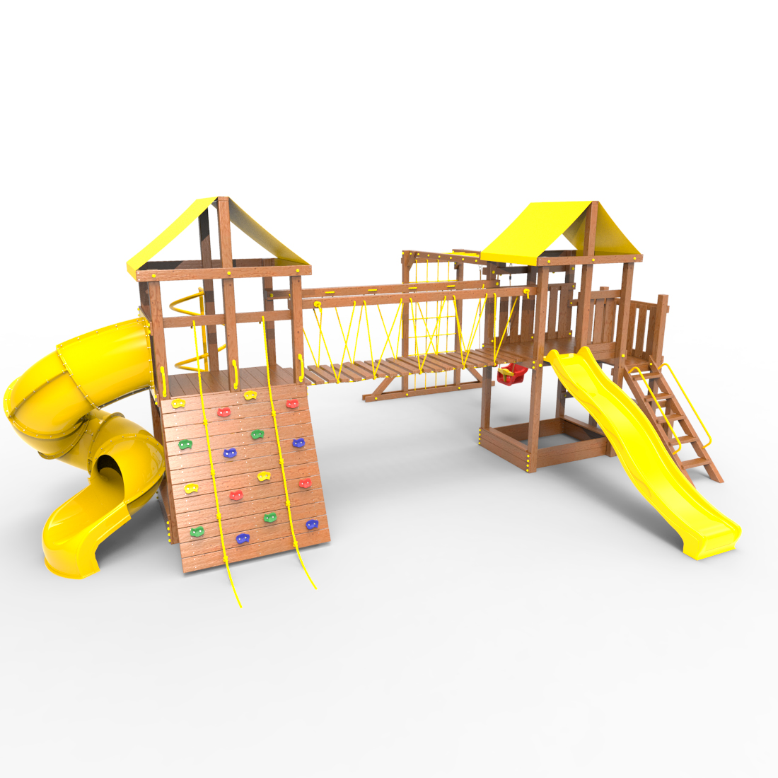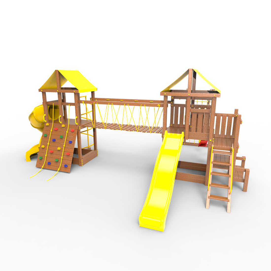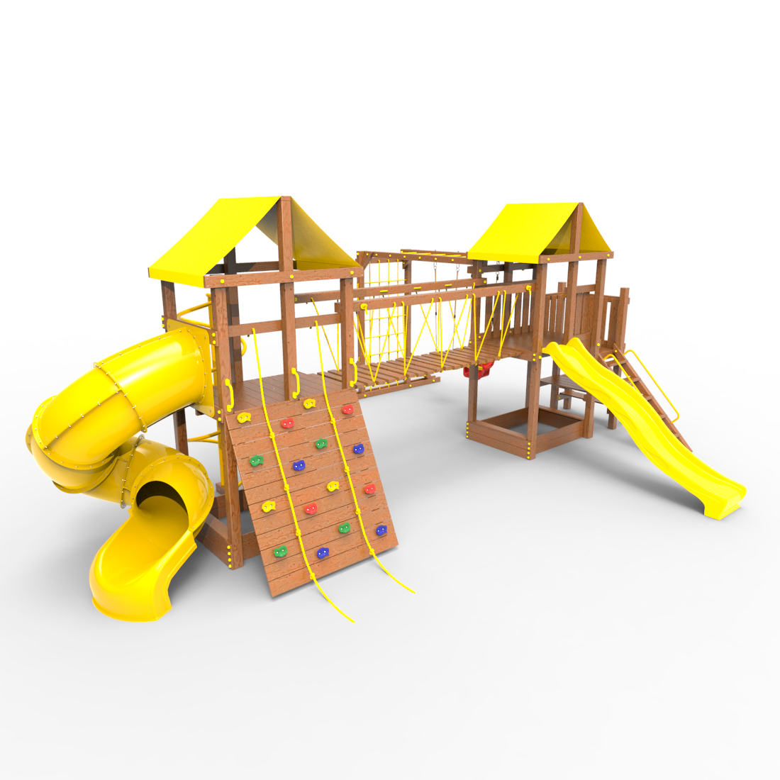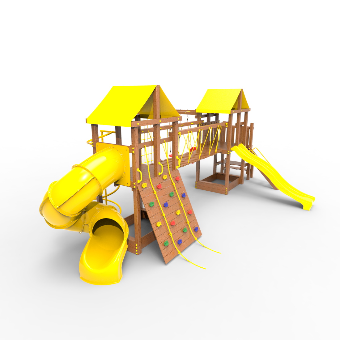 | Комплектация | Два домика|Песочница|Лестница|Шторм-трап|Скалодром|Рукоход|Руфер|Балкон|Столик с лавочками|Подвесной мост|Горка|Спираль|Сеть для лазания|Качели|Винтовая труба |