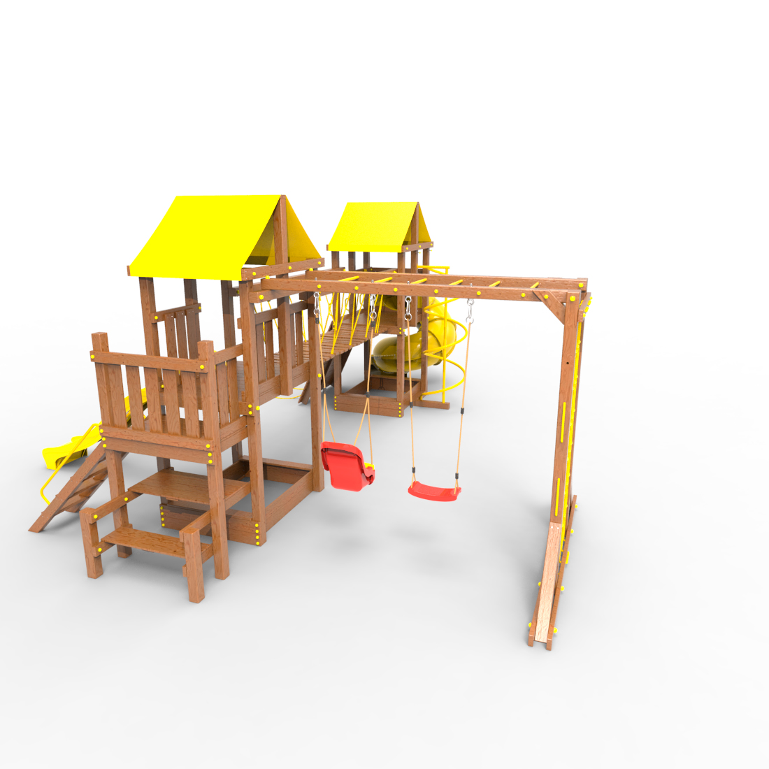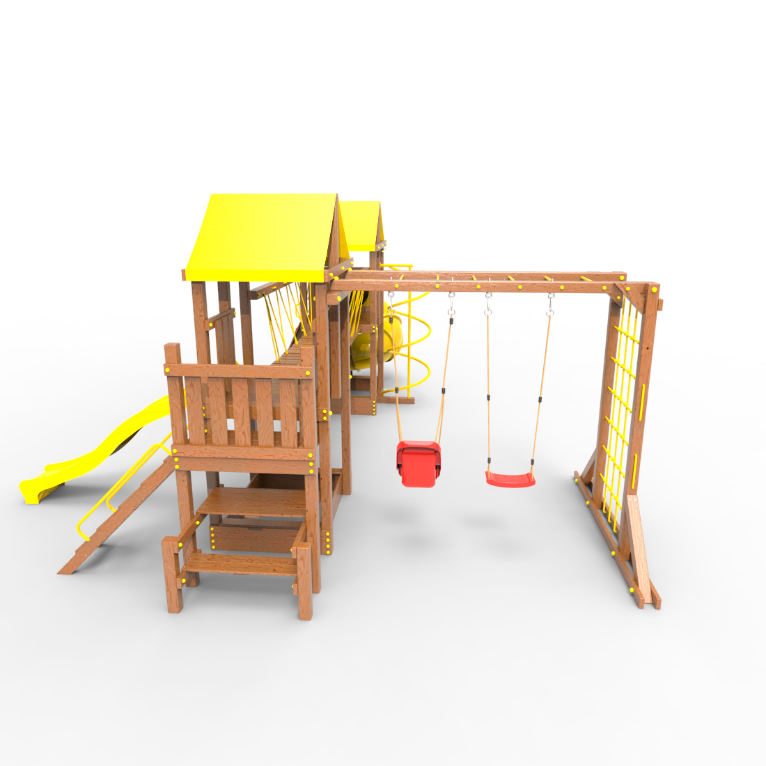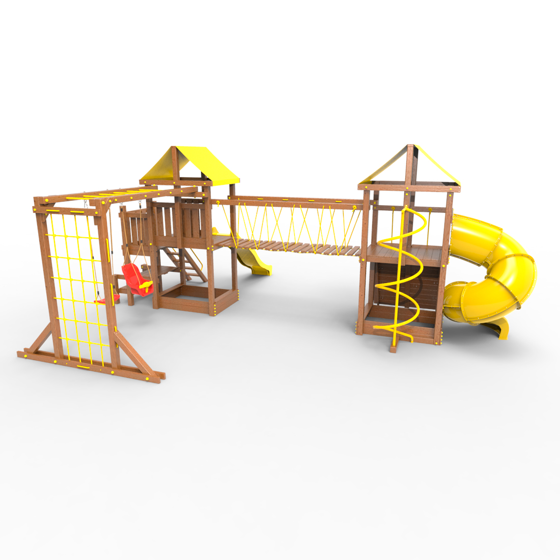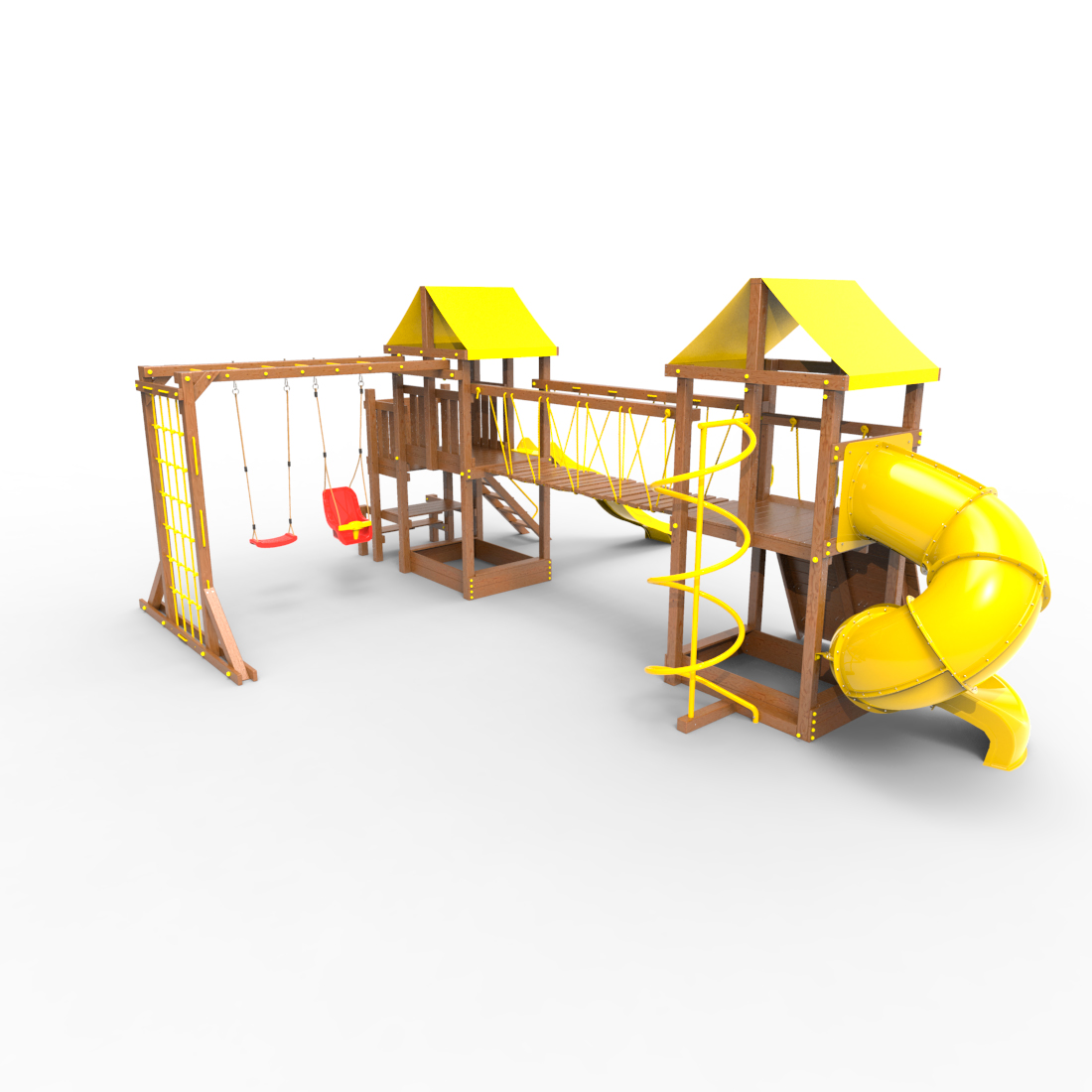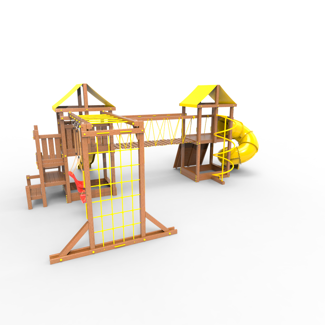 | Комплектация | Два домика|Песочница|Лестница|Шторм-трап|Скалодром|Рукоход|Руфер|Балкон|Столик с лавочками|Подвесной мост|Горка|Спираль|Сеть для лазания|Качели|Винтовая труба |