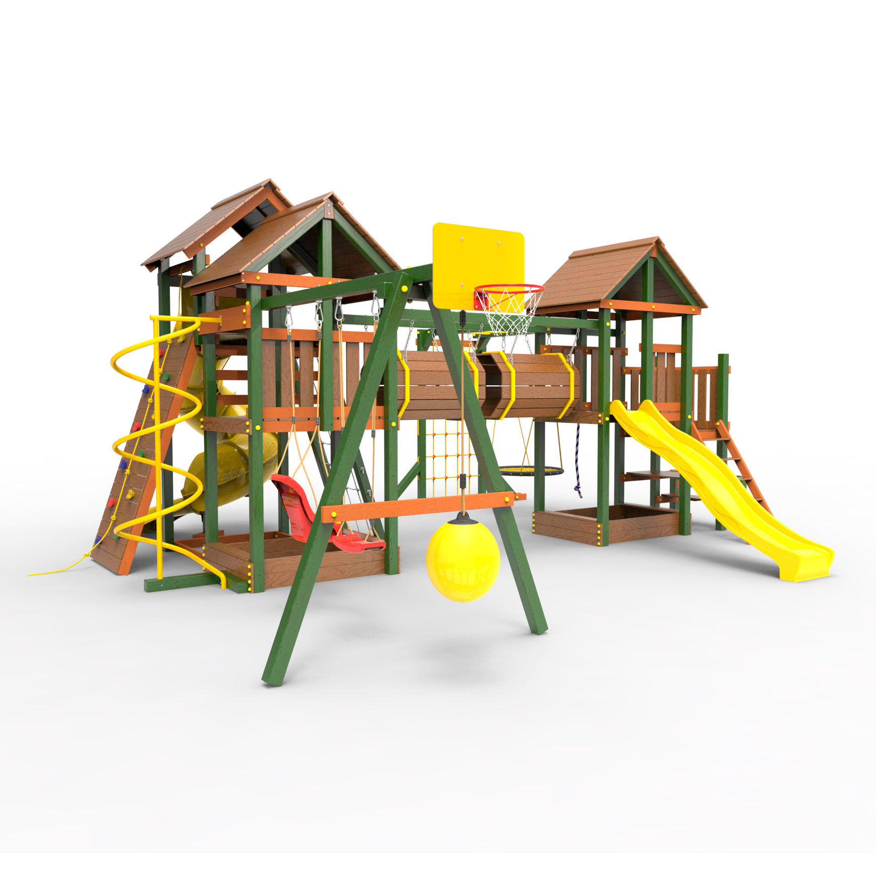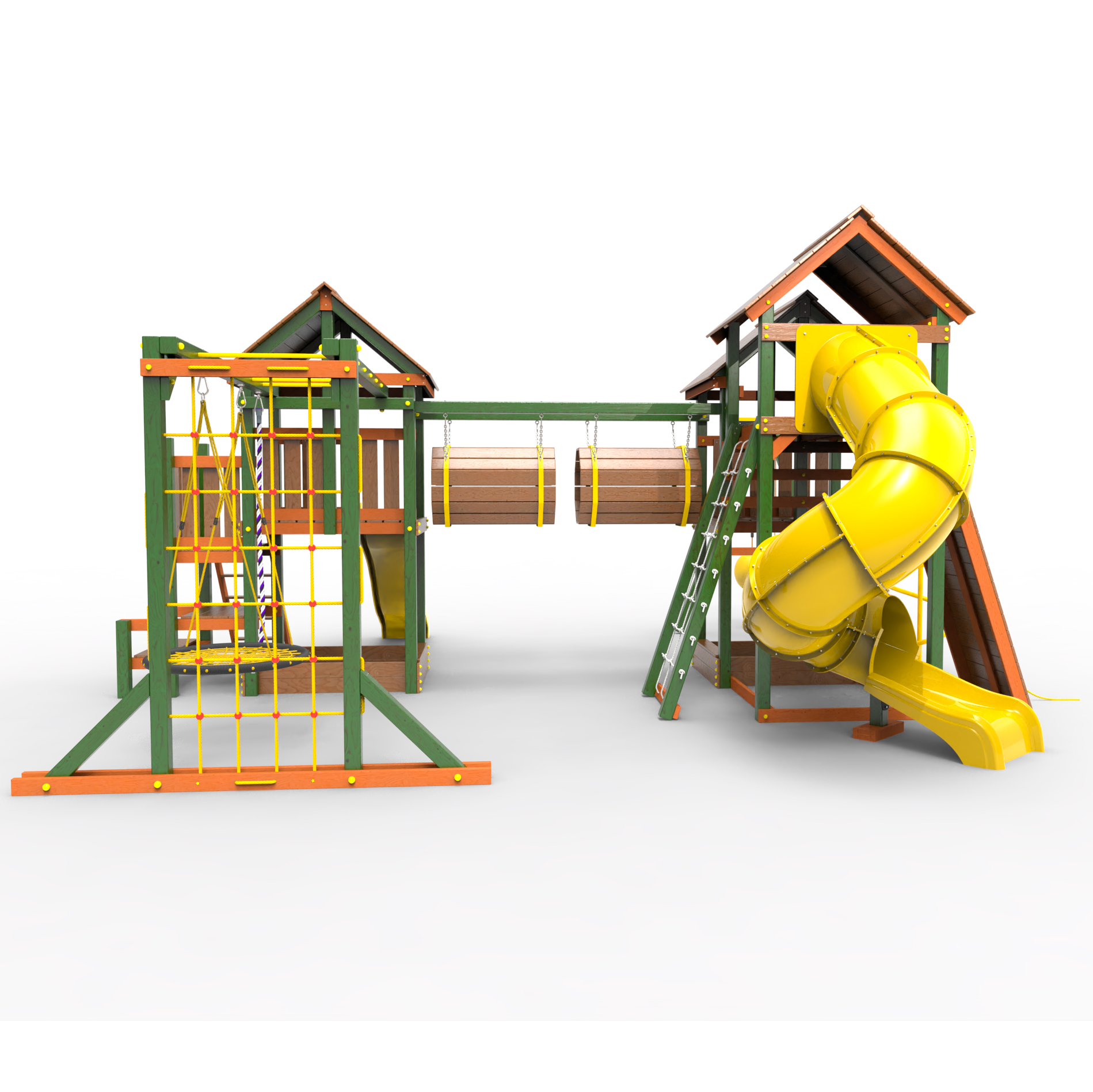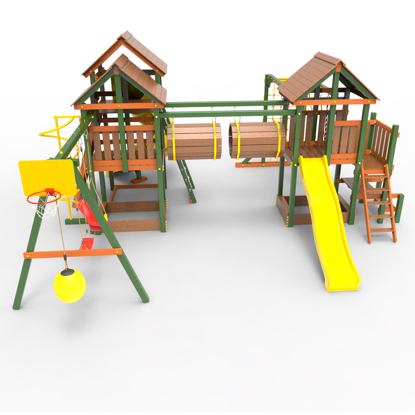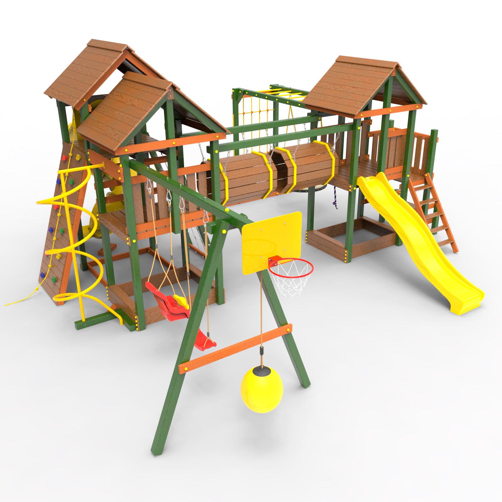 Два домика|Песочница|Лестница|Шторм-трап|Скалодром|Рукоход|Шведская стенка|Турник|Руфер|Баскетбольная корзина|Мостик|Горка|Спираль|Волна|Сеть для лазания|Качели |