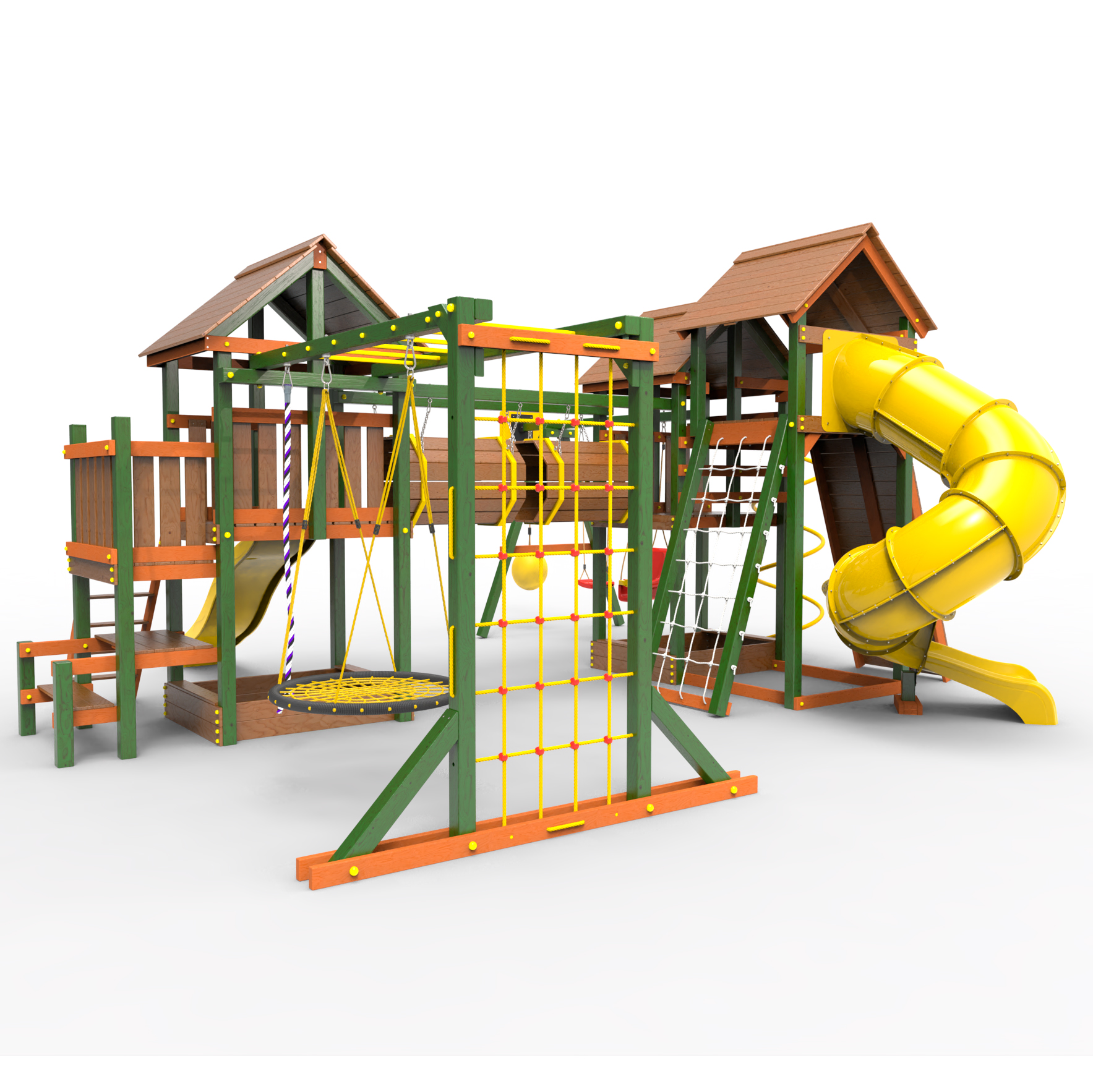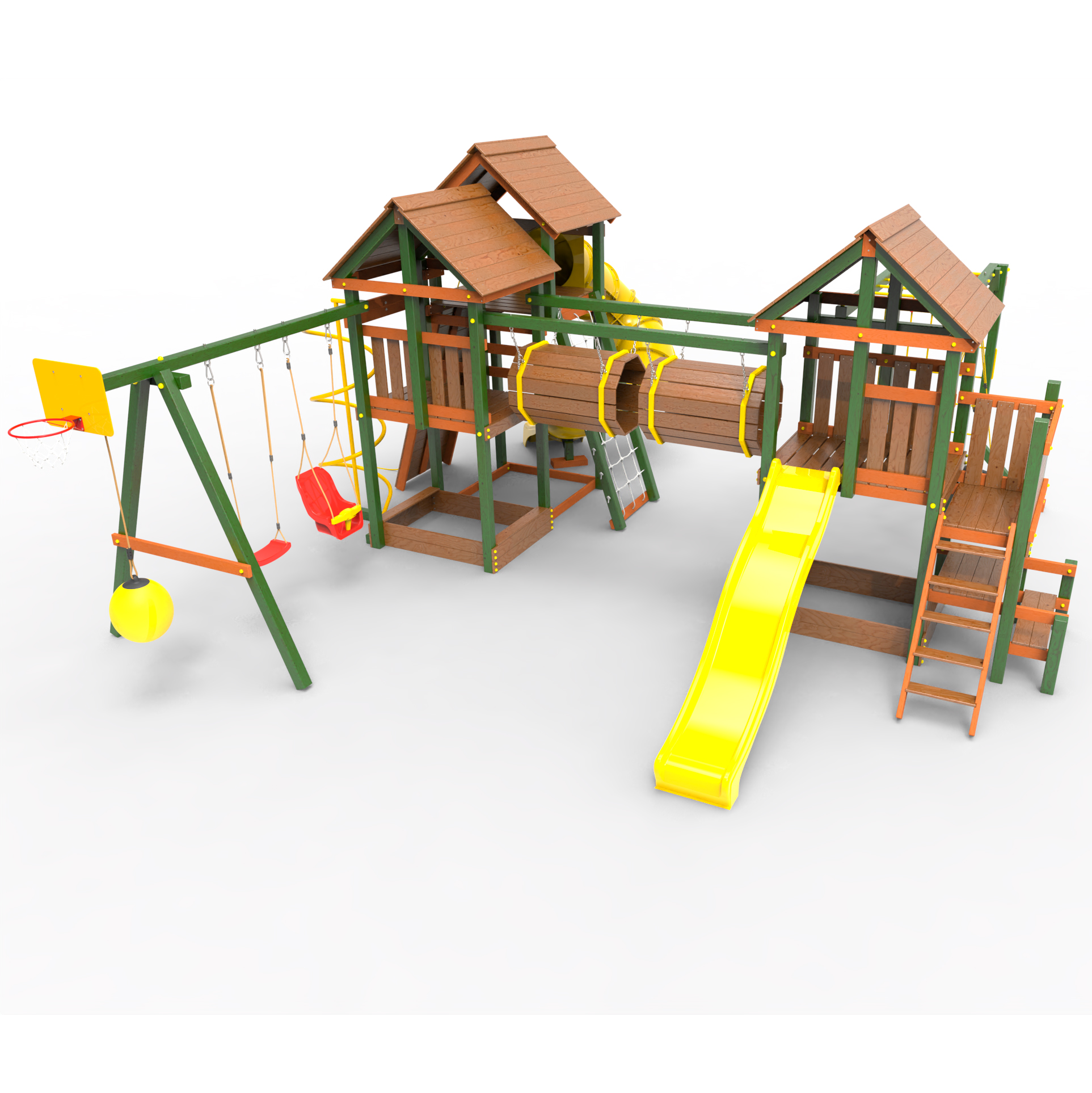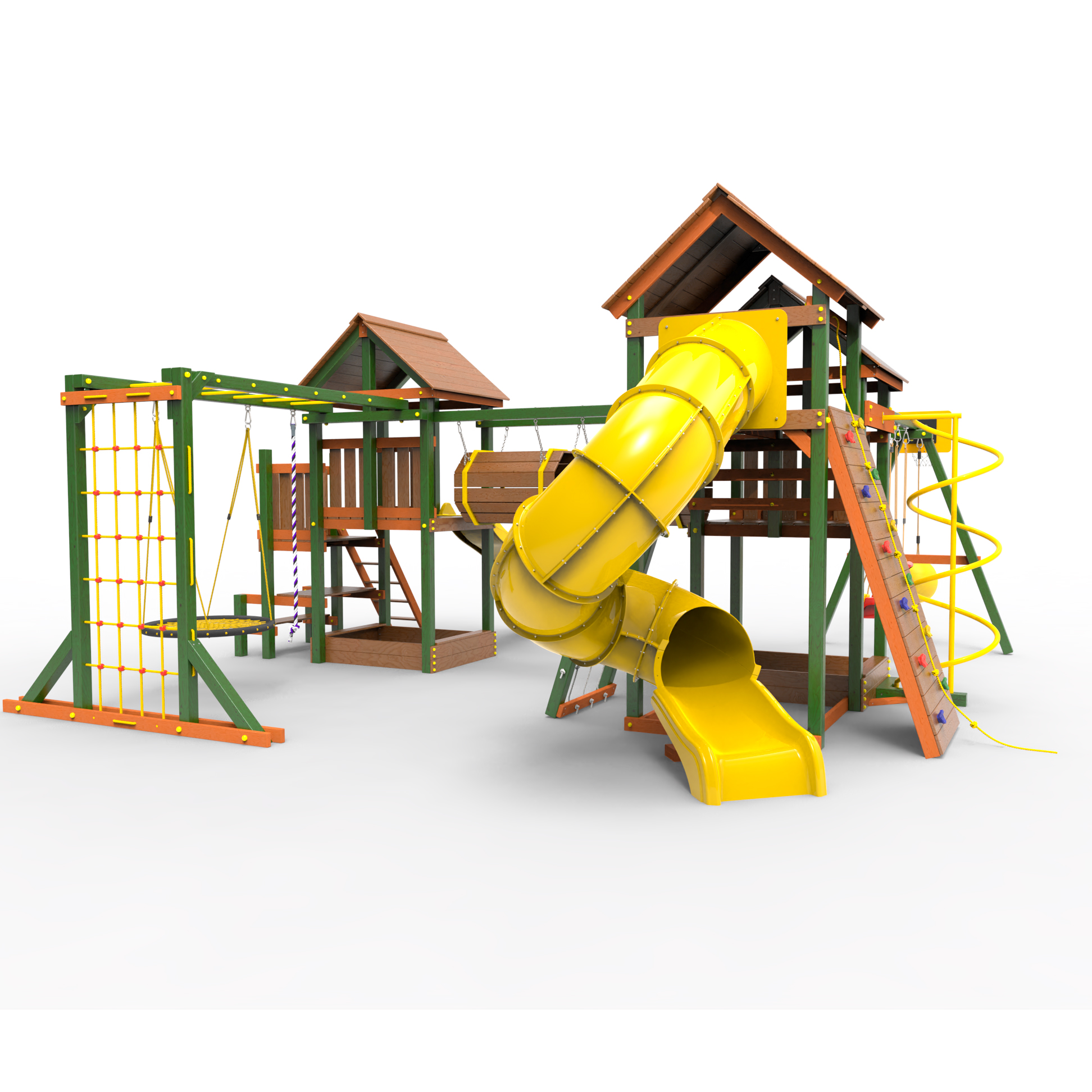 Два домика|Песочница|Лестница|Шторм-трап|Скалодром|Рукоход|Шведская стенка|Турник|Руфер|Баскетбольная корзина|Мостик|Горка|Спираль|Волна|Сеть для лазания|Качели |