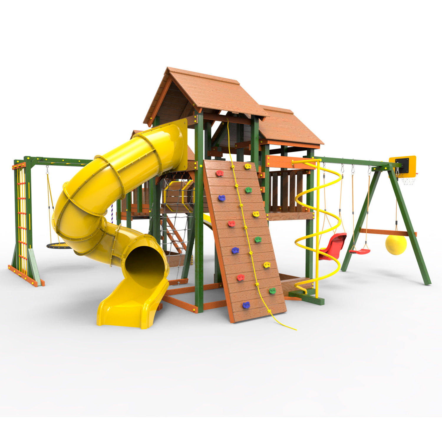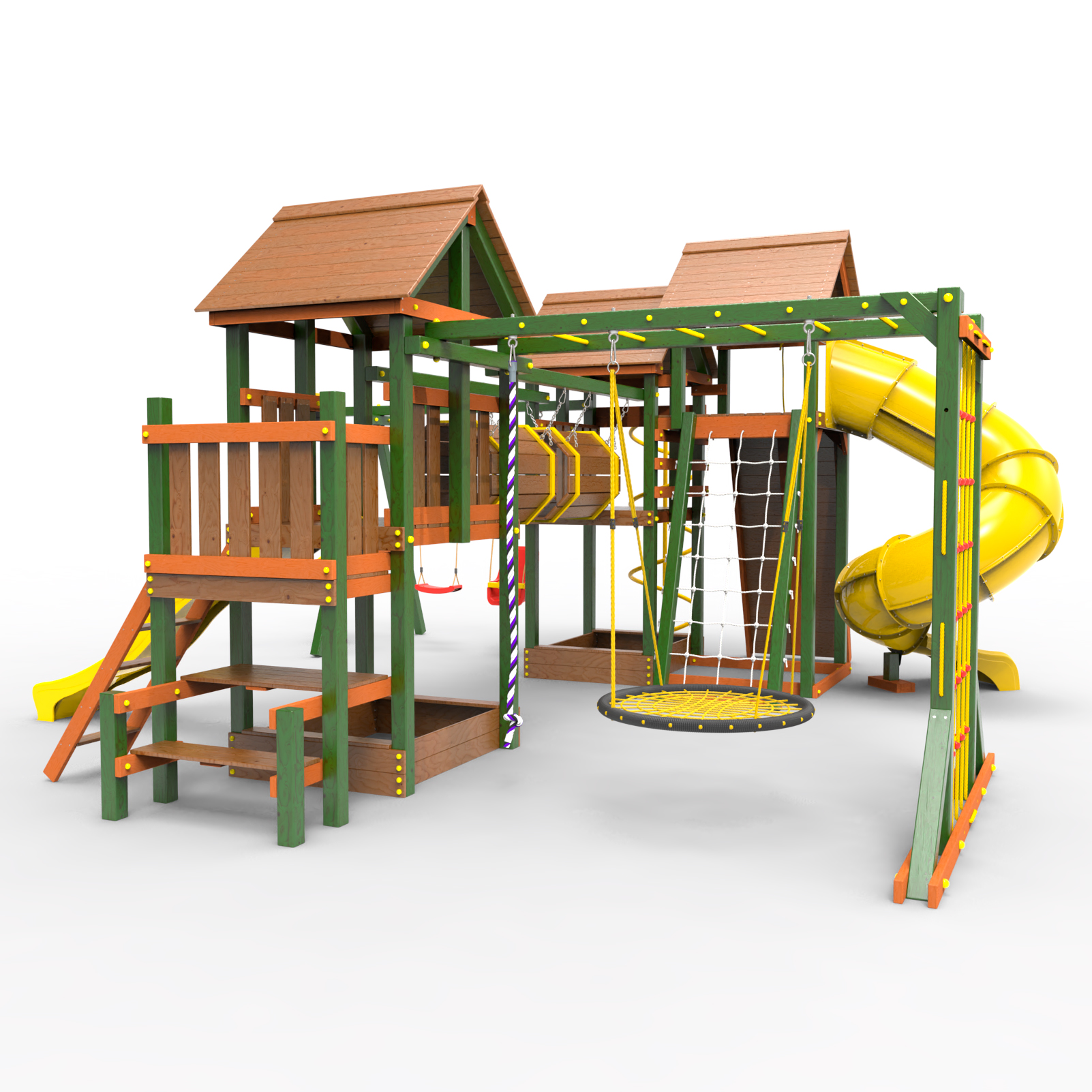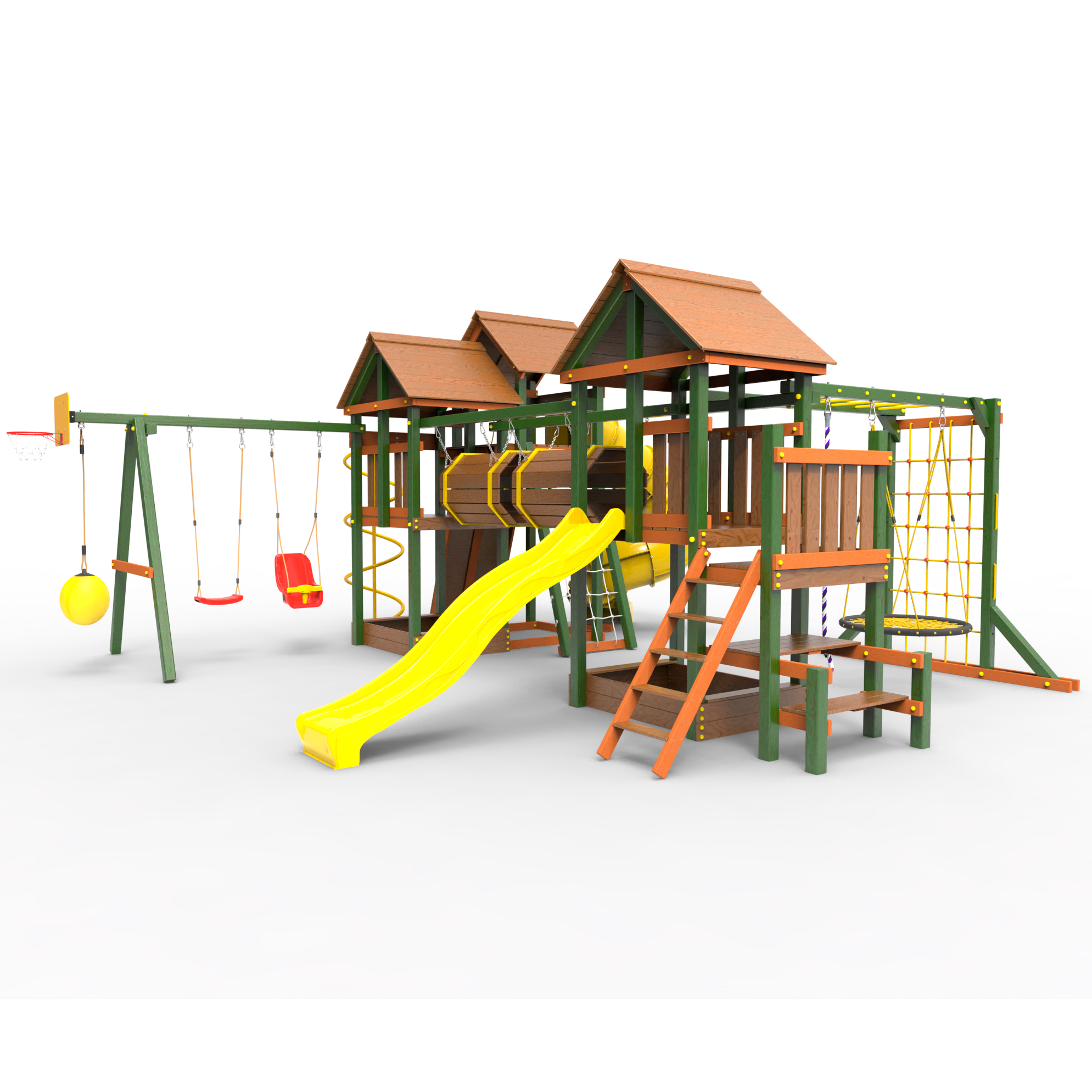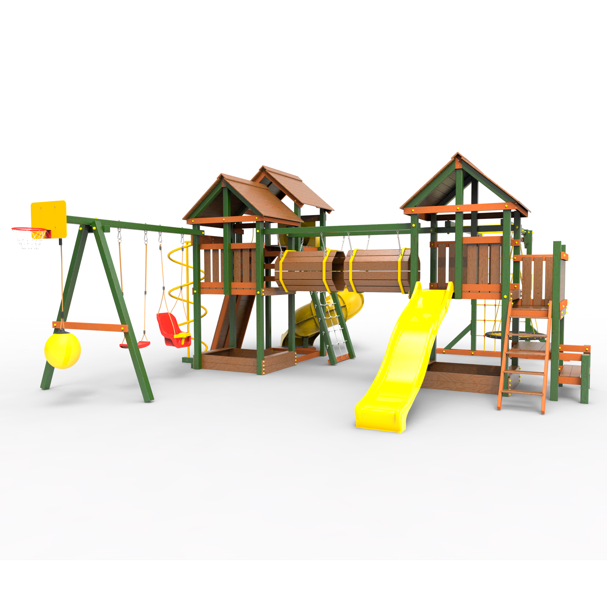 Два домика|Песочница|Лестница|Шторм-трап|Скалодром|Рукоход|Шведская стенка|Турник|Руфер|Баскетбольная корзина|Мостик|Горка|Спираль|Волна|Сеть для лазания|Качели |