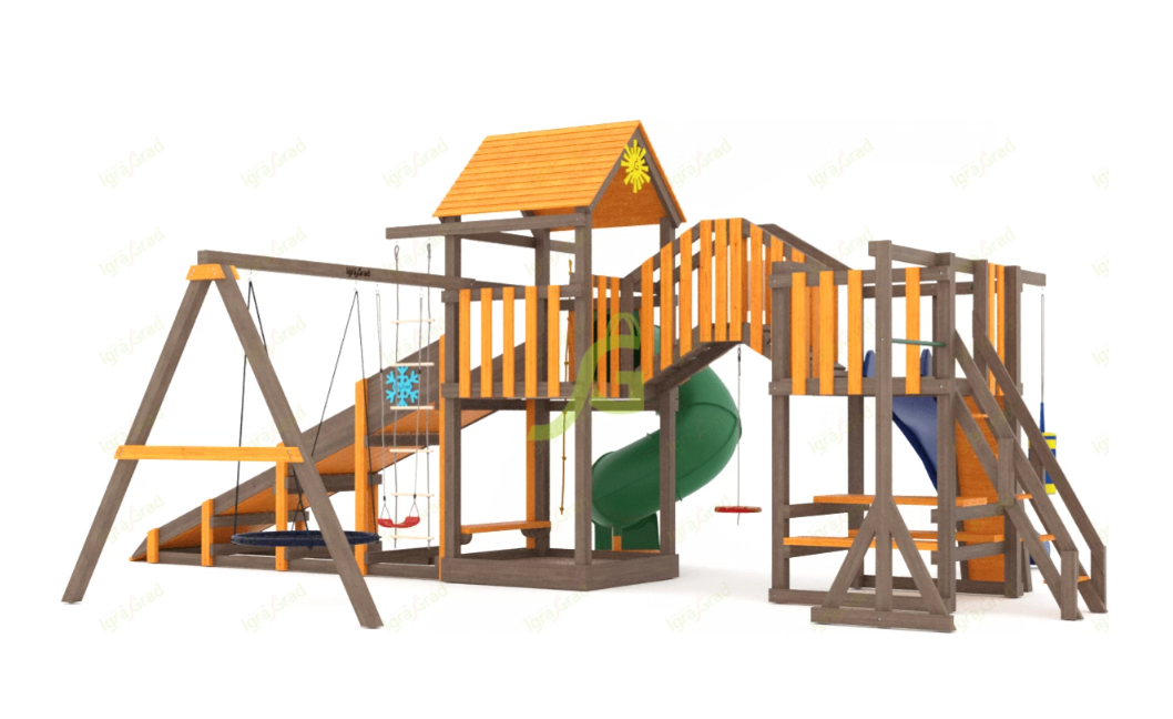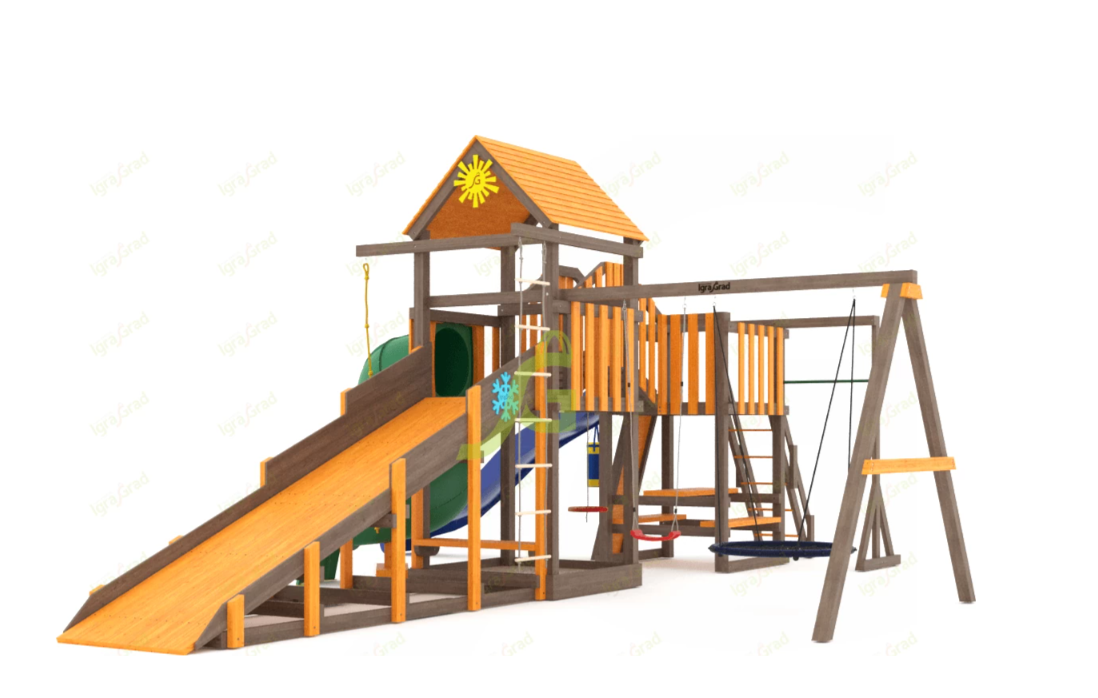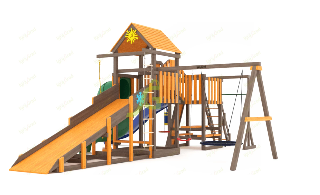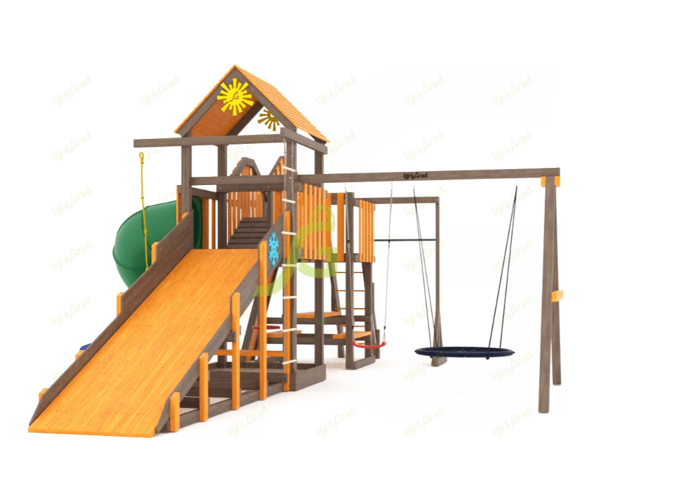 По желанию клиента игровая площадка может быть укомплектована дополнительными элементами. Можно заменить обычные качели на качели-гнездо, которые очень удобны в использовании. Наши специалисты обсудят с вами все детали заказа и быстро оформят заявку.