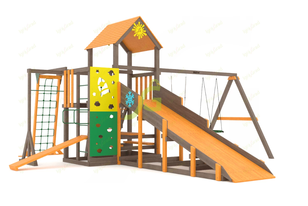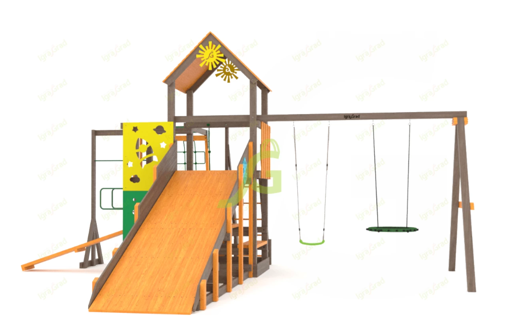 По желанию клиента игровая площадка может быть укомплектована дополнительными элементами. Можно заменить обычные качели на качели-гнездо, которые очень удобны в использовании. Наши специалисты обсудят с вами все детали заказа и быстро оформят заявку.