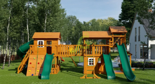 Просто огромный комплекс для детей красиво впишется в ландшафт загородного дома, его стильные башенки с белыми окошками на фоне сочной зелени украсят ваш сад. А самое главное, множество развлечений надолго отвлекут детей от вредных гаджетов, позволят выманить малышей-домоседов на свежий воздух. Разнообразные спортивные снаряды гарантированно будут воздействовать на все группы мышц мальчишек и девчонок. Ведь в площадке есть рукоход, скалодром, канат, лестницы и 4 горки для самых отважных. А для романтичных принцесс и творческих натур предусмотрены разного вида качели, доска для рисования, игра «крести-нолики» и игровой прилавок.