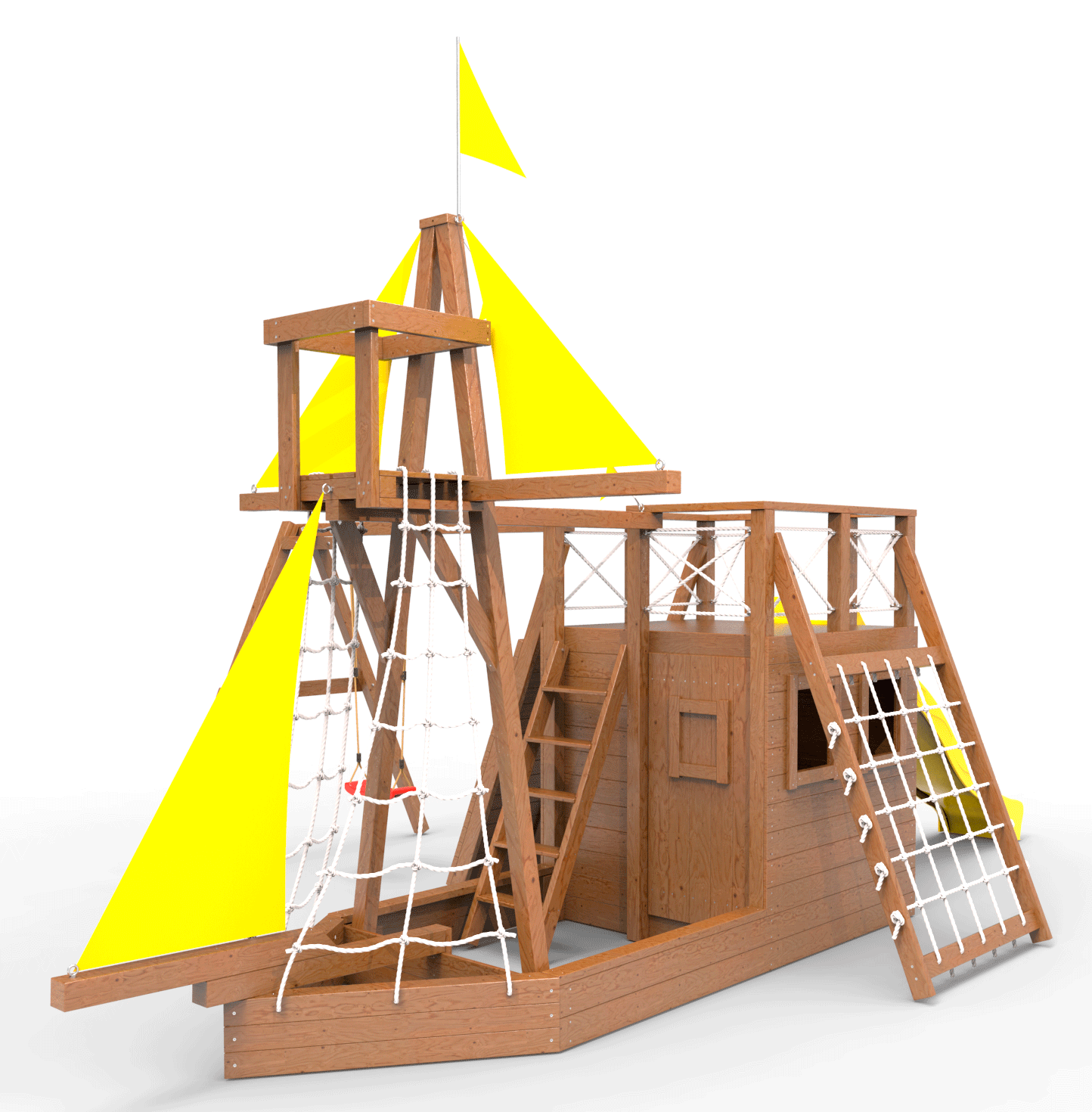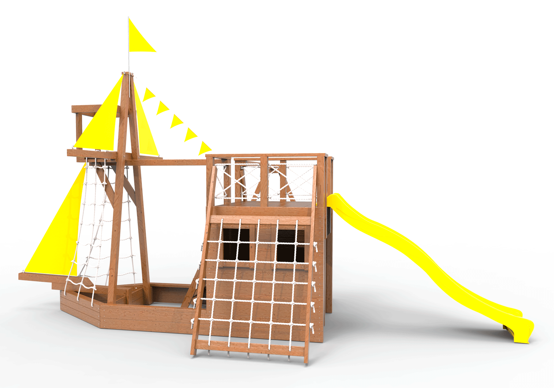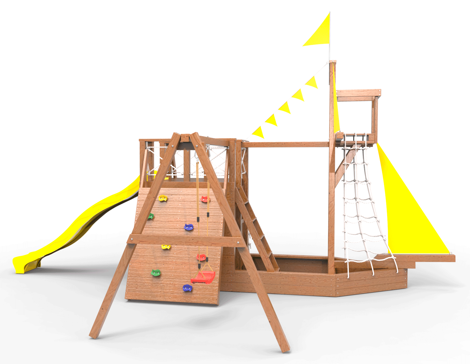 Большой корабль под настоящими парусами умчит вашего ребенка в мир его фантазий, где можно найти клад на островах, посетить невиданные страны, подружиться с необычными морскими обитателями. Такое чудо увлечет любого малыша! А благодаря тому, что в комплектацию «Корабля Океан» входят и классические элементы детских площадок: горка, качели, песочница, скалодром, сеть для лазания и домик – игры будут разнообразнее и полезнее.