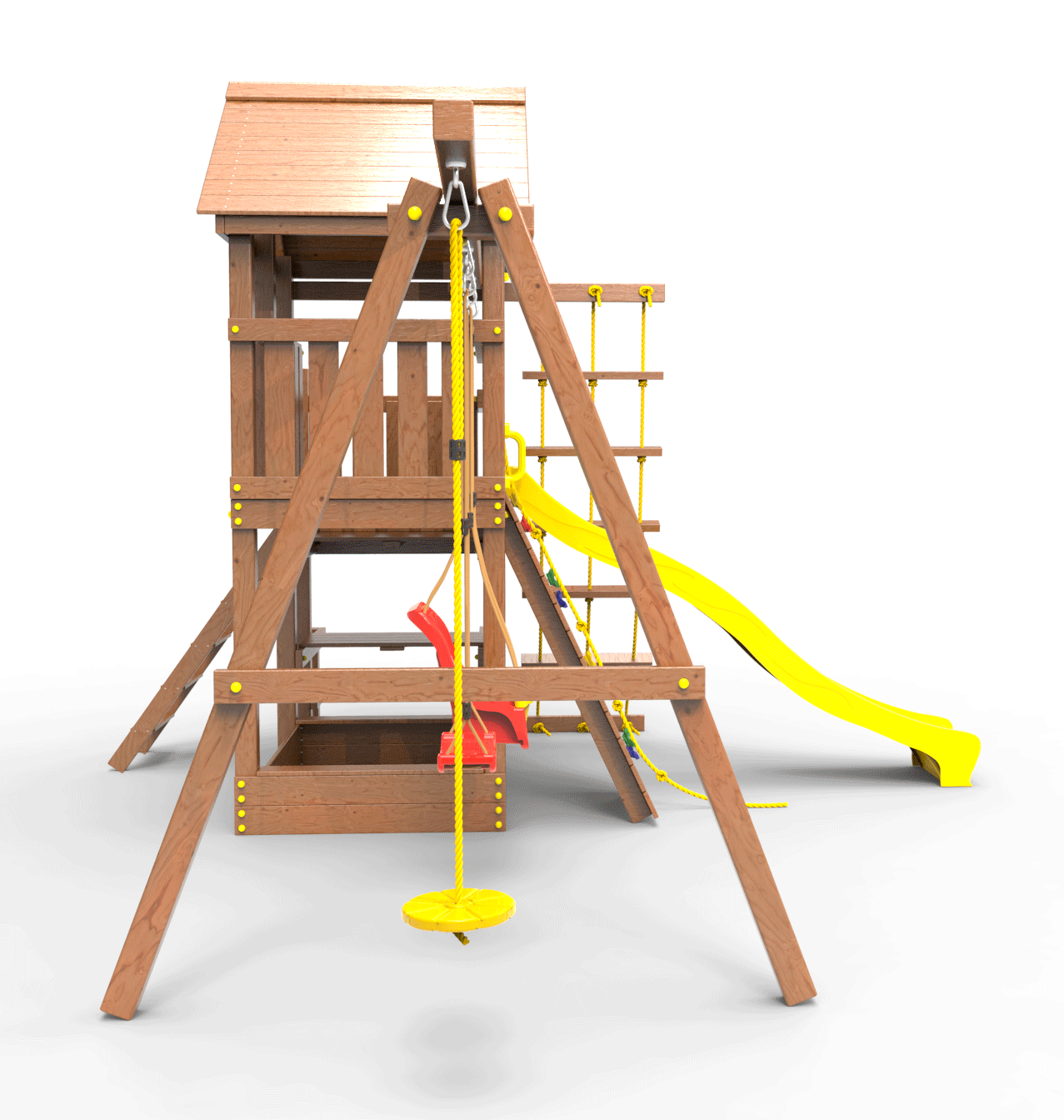 ● деревянная крыша ● трап 2м с канатом ● поручни для лестницы ● диван на цепях двухместный ● столик в песочницу