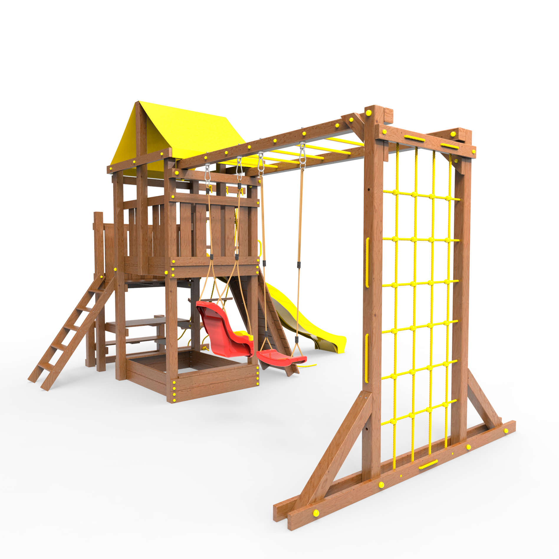 | Комплектация | Домик|Песочница|Лестница|Шторм-трап|Скалодром|Балкон|Столик с лавочками|Горка|Качели|Рукоход|Руфер|Сеть для лазания |