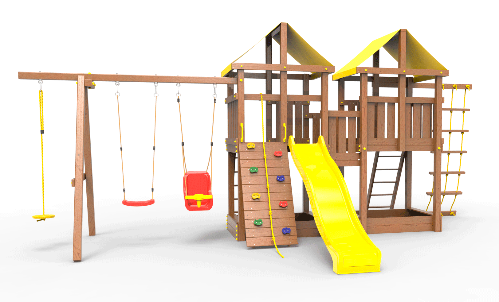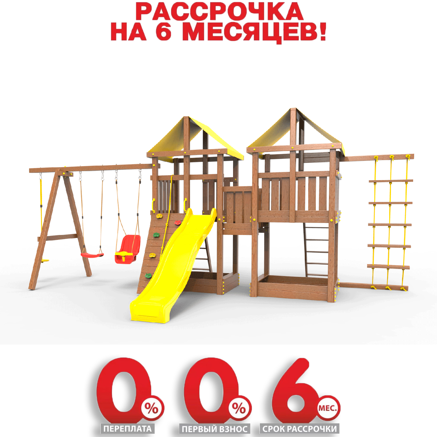 Обращаем Ваше внимание, что фактический цвет детской площадки может отличаться от представленных фото на сайте. Специфика окраски нетоксичными пропитками и красителями допускает отклонения в цветовой гамме отгружаемых изделий. Также обратите внимание, что фактический цвет может отличаться из-за цветопередачи устройства на котором Вы смотрите фото.