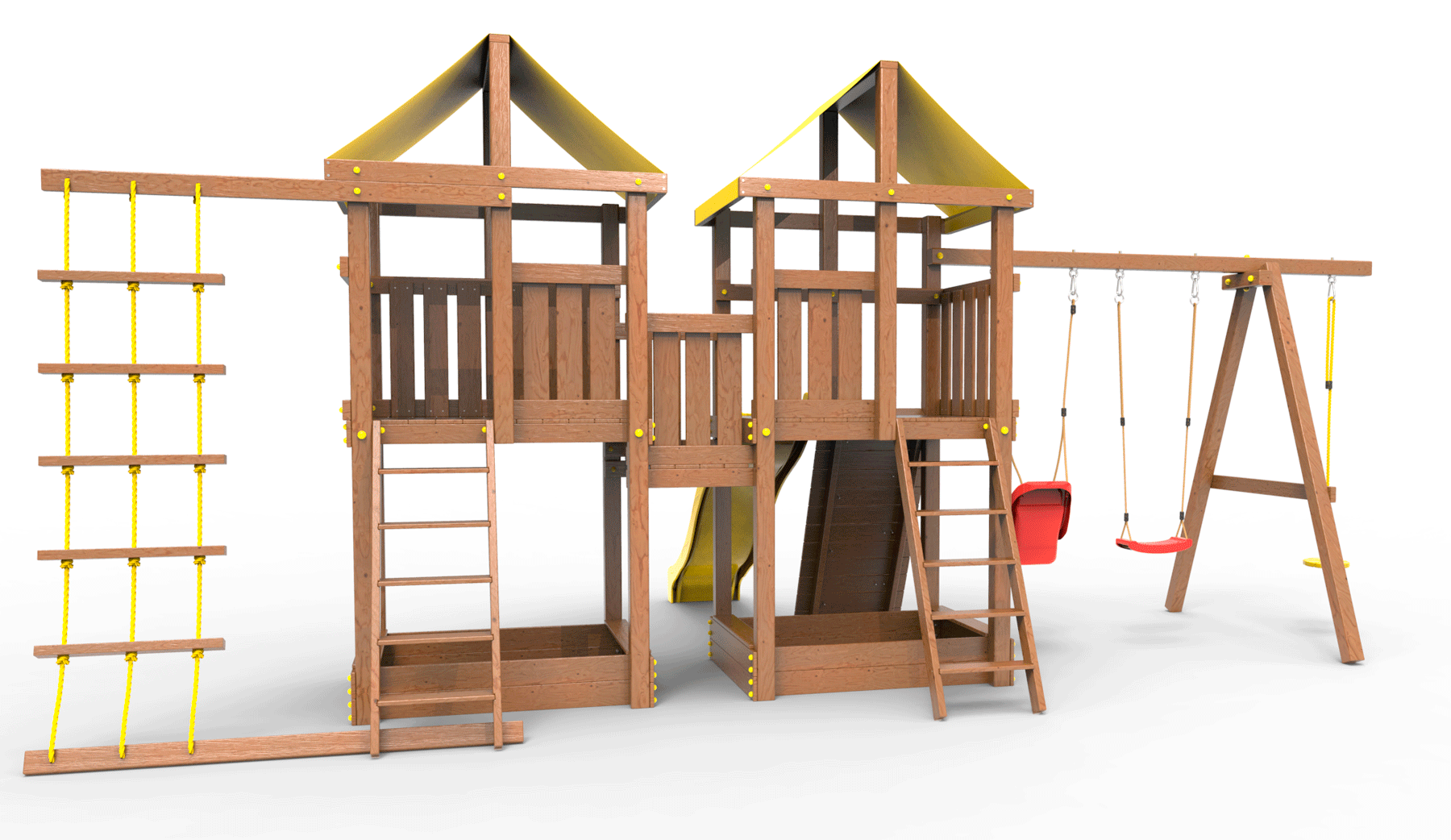 Все столбы и качельная балка площадки выполнена из высокопрочного клеёного бруса камерной сушки сечением 90х90мм.