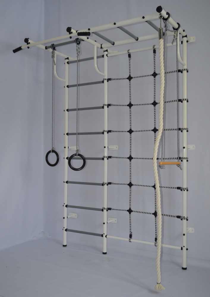 Канат, трапеция, кольца гимнастические, сетка для лазания с пластиковыми черепашками.