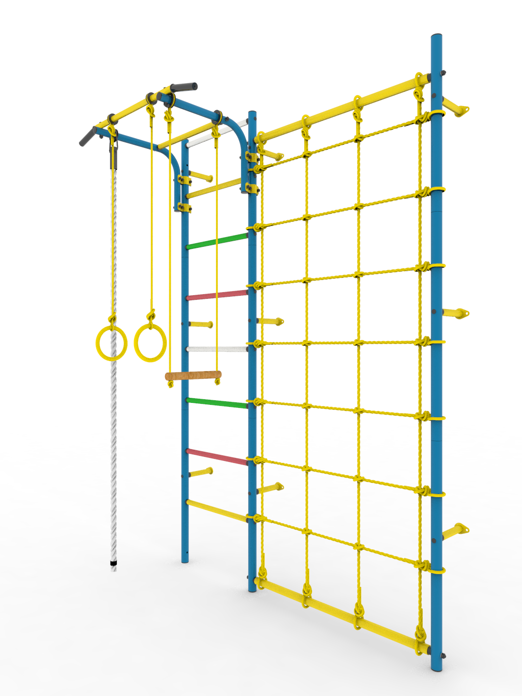 - Комплектация: турник (регулируемый по высоте), кольца гимнастические, канат, трапеция, сетка