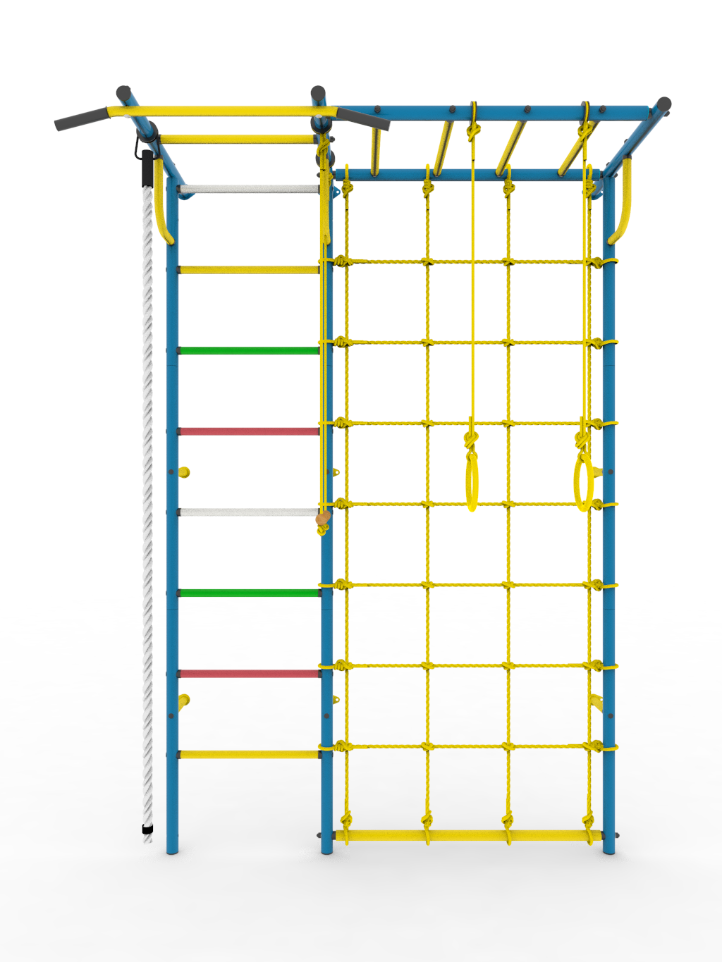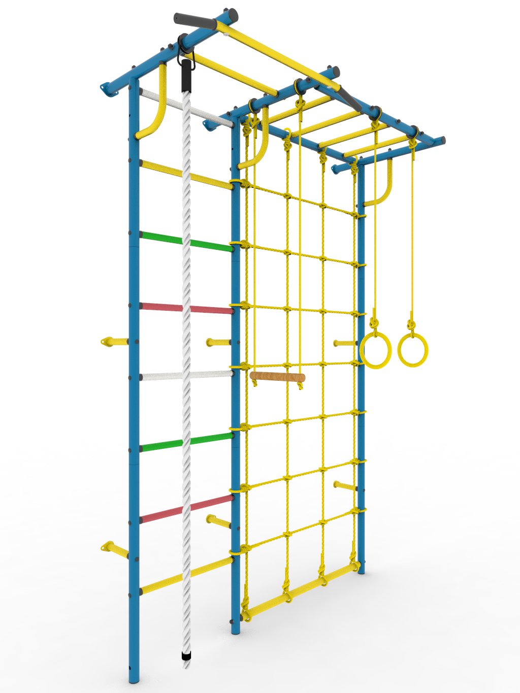 - Комплектация: турник, кольца гимнастические, канат, трапеция, сетка