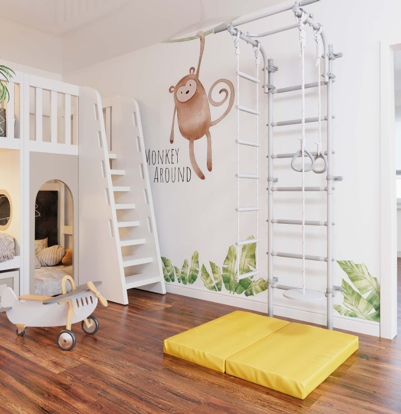 Серый цвет ступеней гармонично сочетается с серым корпусом, спортивный уголок стильно выглядит в любом интерьере.