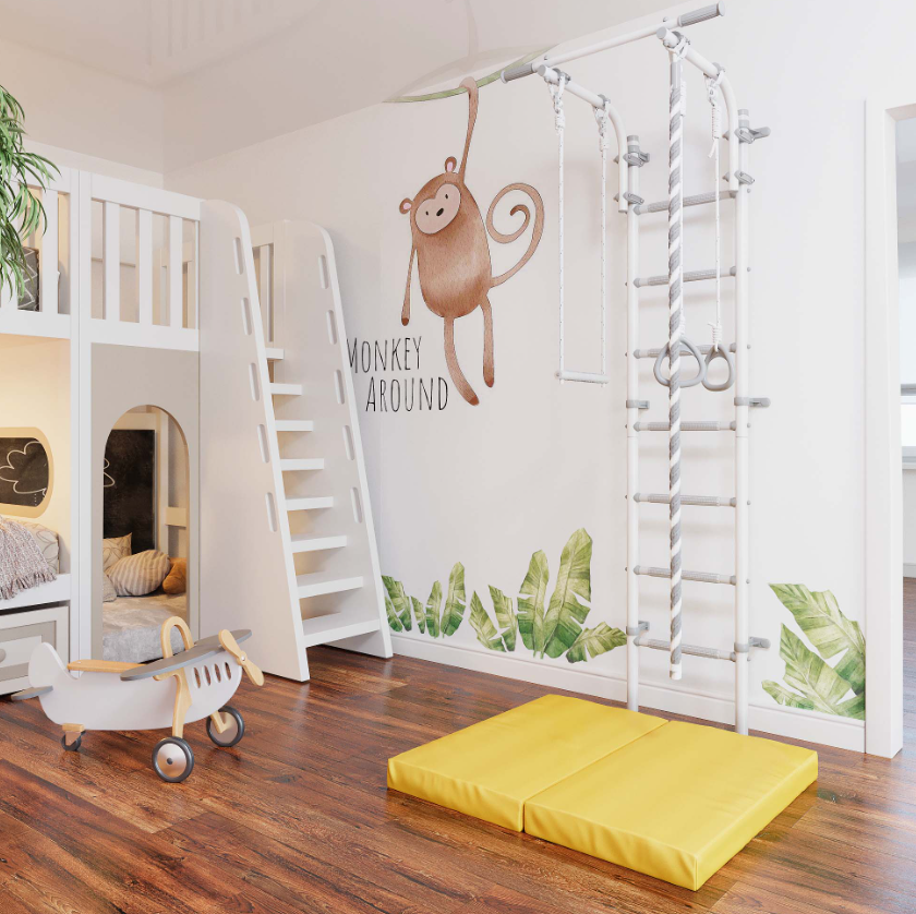 Пастельный цвет ступеней гармонично сочетается с серым корпусом, спортивный уголок стильно выглядит в любом интерьере.