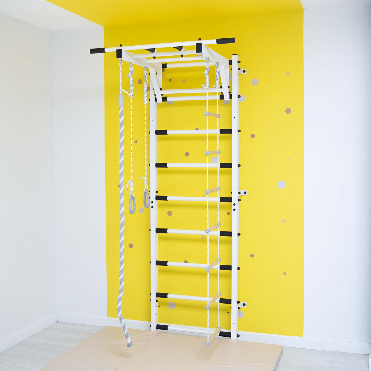 Комплекс изготовлен из экологичных и гипоаллергенных материалов, легко моется при помощи влажной безворсовой ткани. Все элементы покрыты премиальной краской с эффектом шероховатости, фактурное покрытие которой приятное, бархатистое на ощупь и придает изделию еще более стильный вид. Благодаря лаконичному дизайну домашний комплекс впишется в любой интерьер. Легко собирается и монтируется. Для более безопасных тренировок не забудьте приобрести мягкий защитный мат.