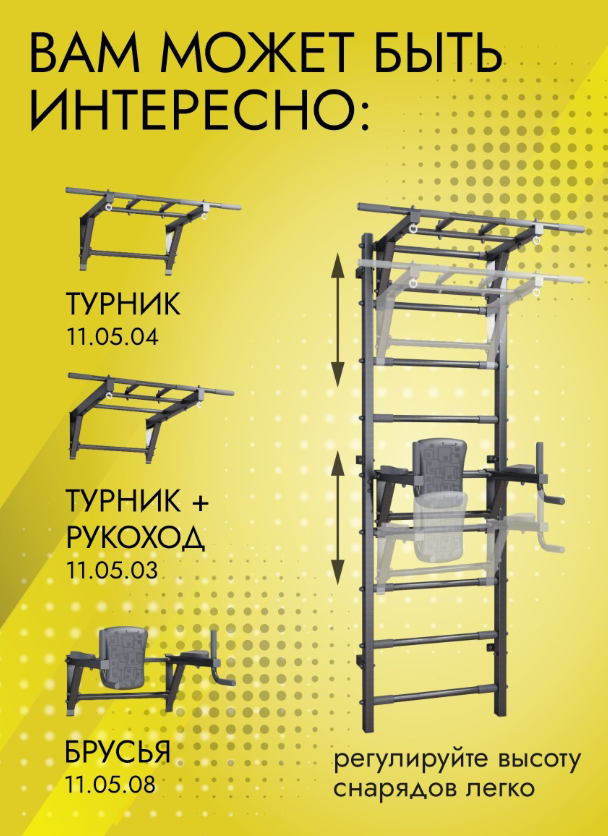 Для разнообразия тренировок и увеличения функционала комплекса вы можете дополнительно купить навесной спортивный инвентарь и снаряды — турник, рукоход или брусья, в зависимости от того, какие упражнения вам необходимы.