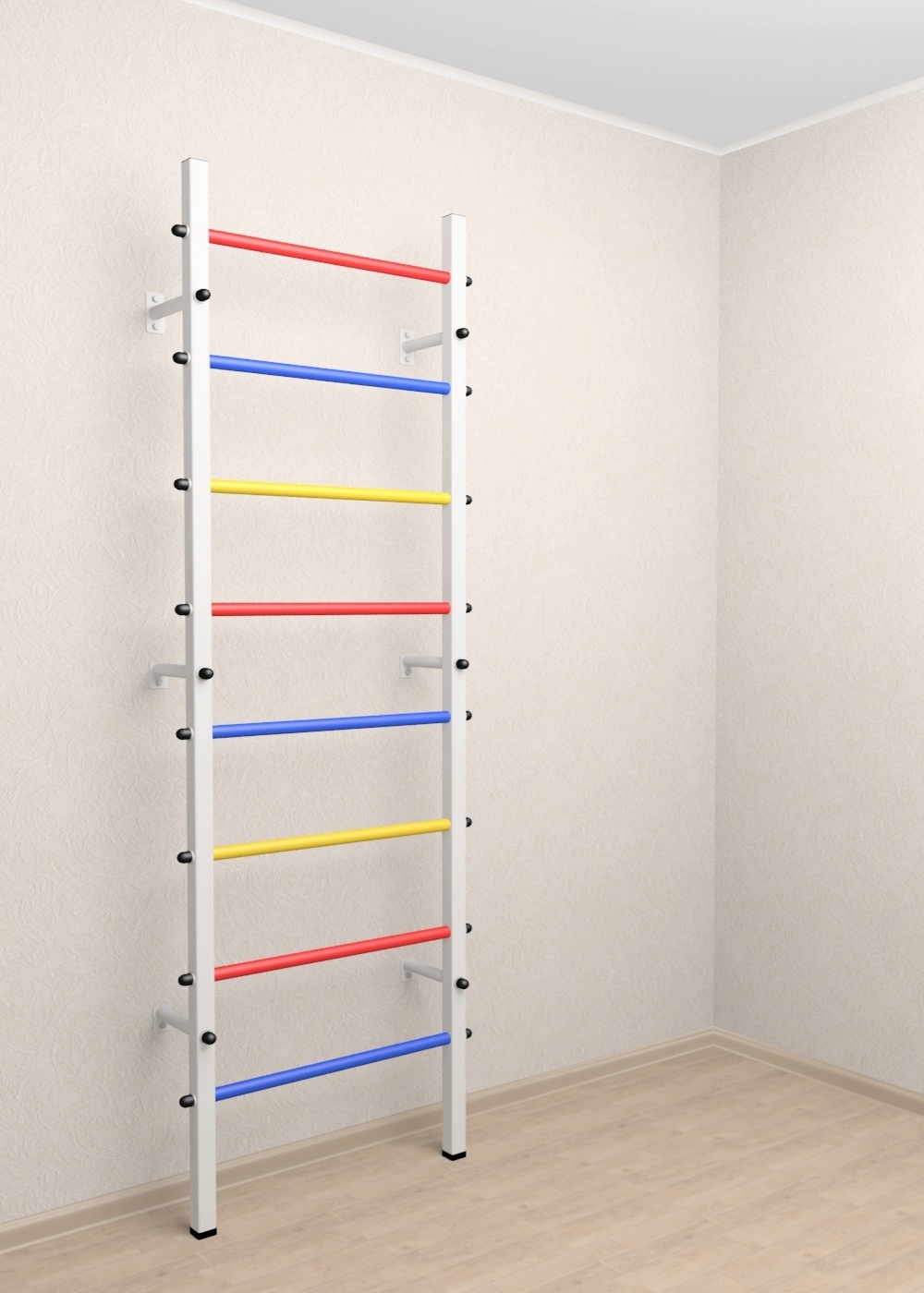 Стойки шведской стенки Sv Sport усиленные изготовлены из профильной трубы 60 х 40 х 2 мм. Ступени изготовлены из круглой, стальной трубы, покрытой резиной (не скользят, не натирают мозоли, не прокручиваются, не имеют запаха, приятны на ощупь). Устанавливается к стене при помощи 6 кронштейнов. На перекладину, в местах хватов, одеты резиновые ручки.