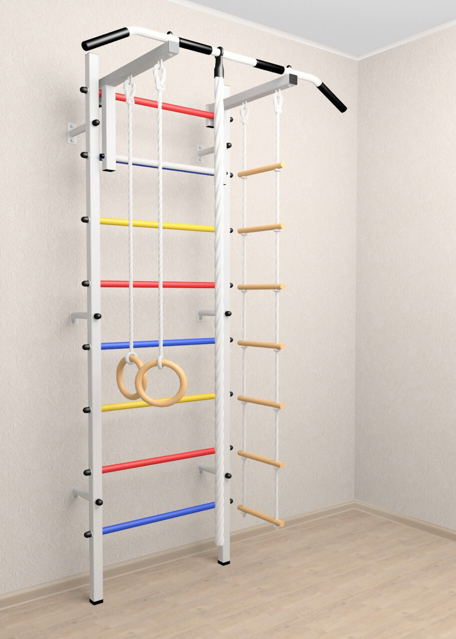 - Комплект: канат с крепежом, кольца гимнастические деревянные, лестница веревочная